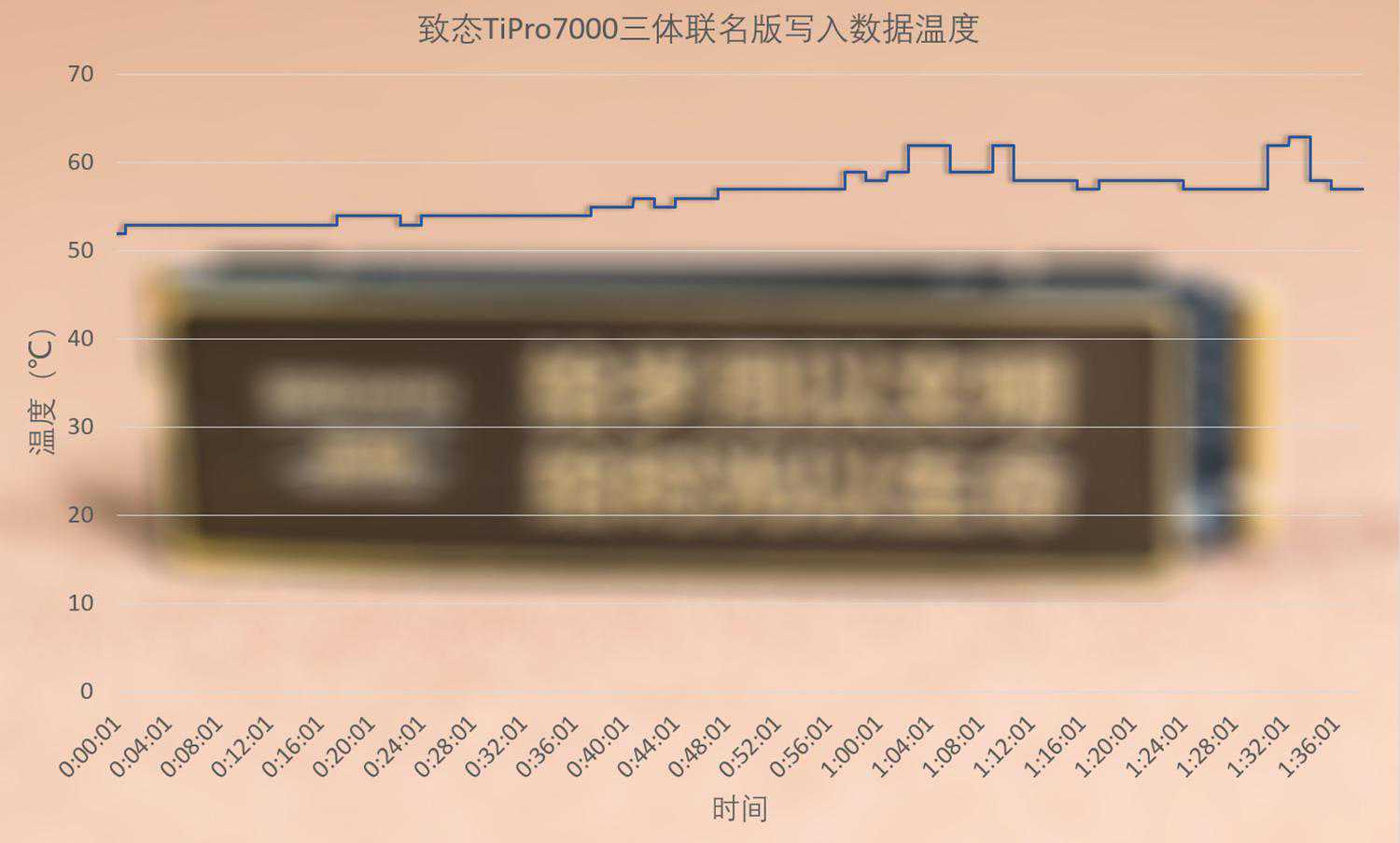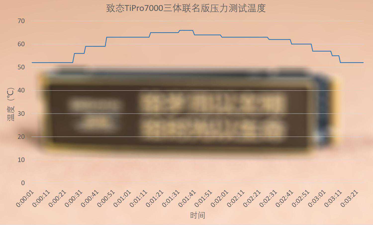 固态硬盘的读写性能基准测试已经完成了,接下来测试固态硬盘的温度表现,假如散热不佳可能会触发高温保护机制,导致降速等情况,致态TiPro7000三体联名版固态硬盘自带有铝金属材质的散热模块,测试时气温为30℃,同时处于非开放式散热环境。