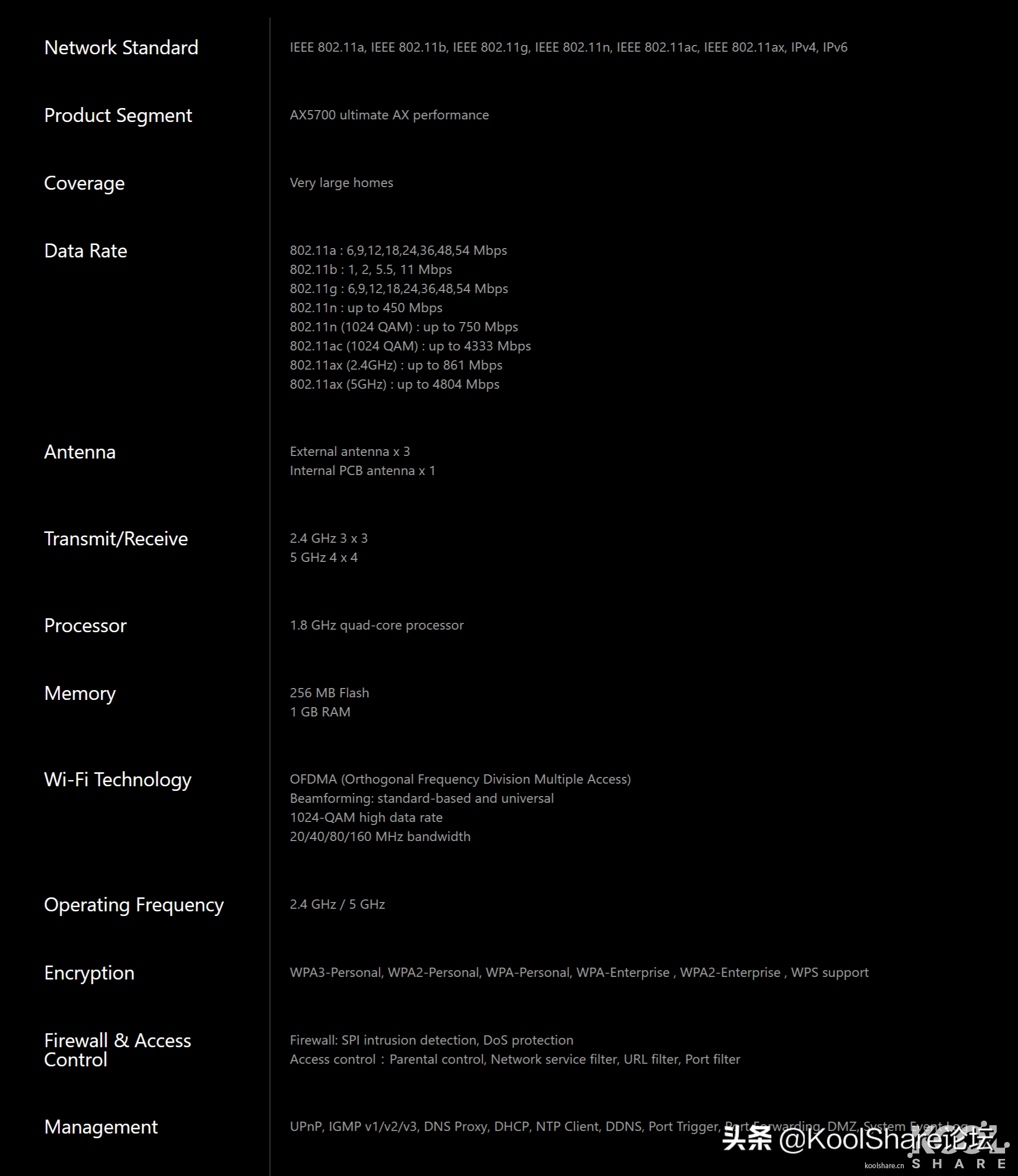 ▲BCM43684,5G部分WLAN芯片,支持802.11AX,支持1024QAM,支持160Mhz频宽,支持4X4MU-MIMO,提供高达4.8Gbps的吞吐量