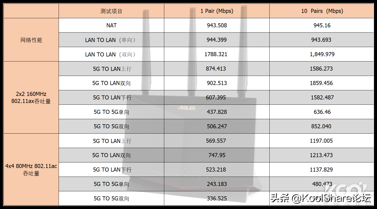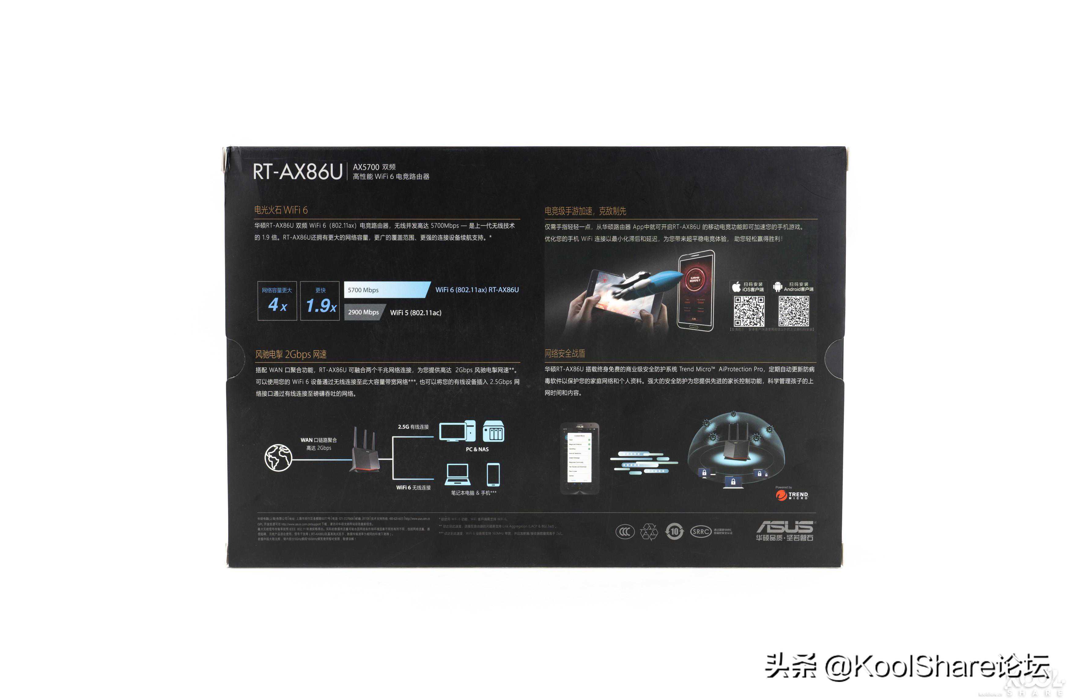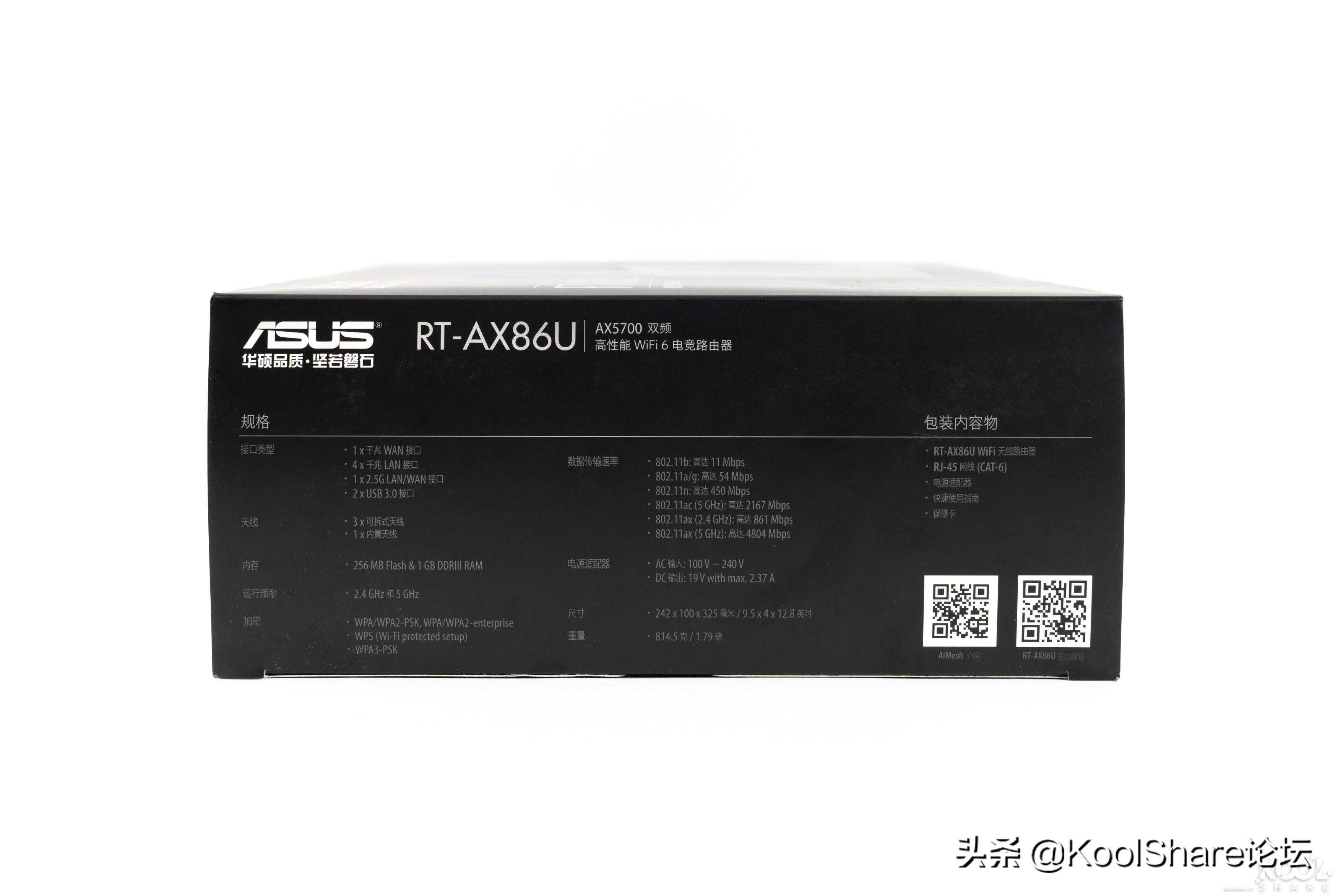 今天来到koolshare评测室的是华硕的RT-AX86U(官网链接)。在未发售前,就有很多用户对其非常的感兴趣。作为经典的AC86U的升级款,RT-AX86U新增了2.5G端口,升级了WiFi6(802.11AX)支持,达到2.4G861Mbps+5G4804Mbps规格,下面为大家带来这款WiFi6路由的评测