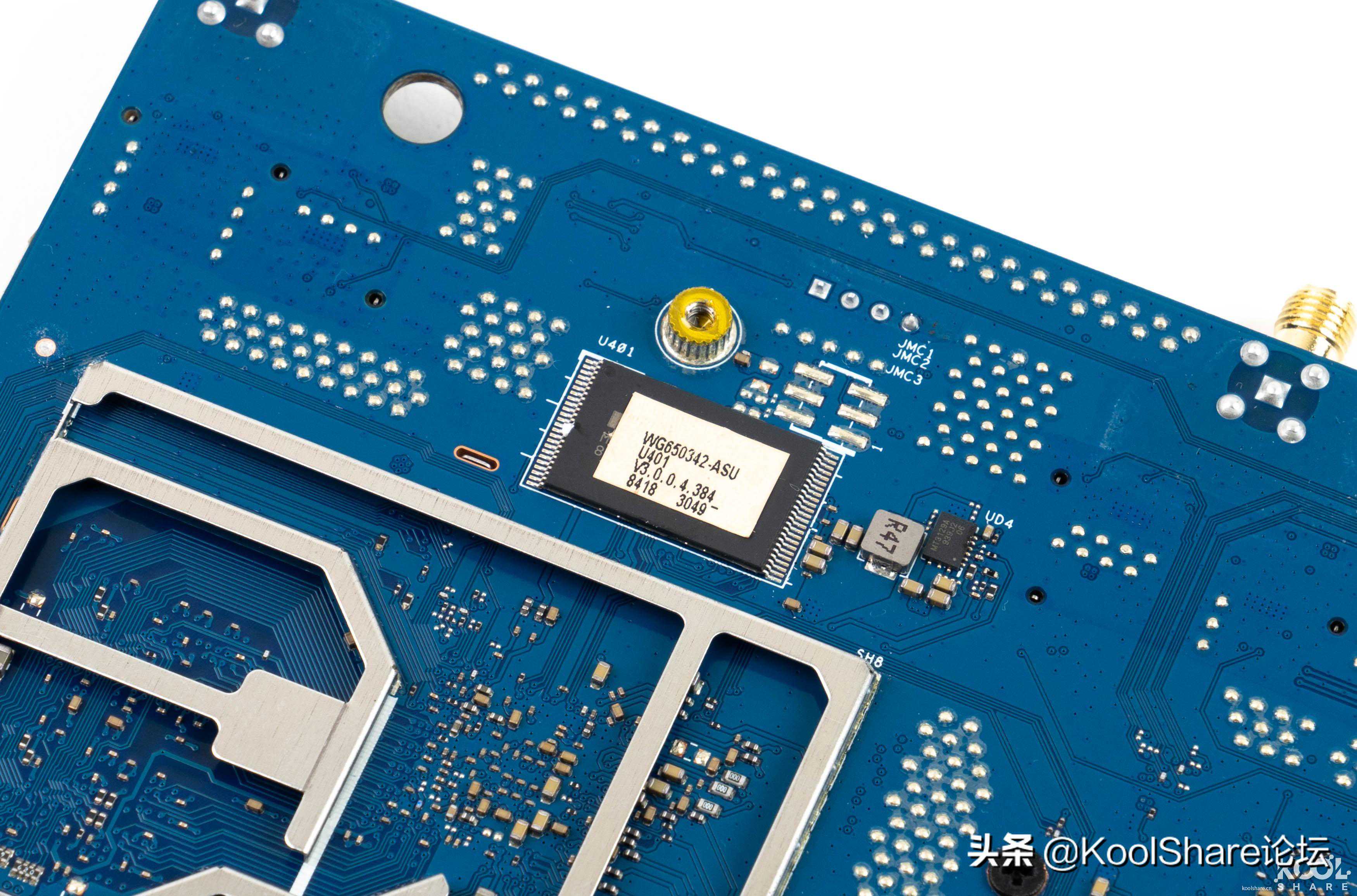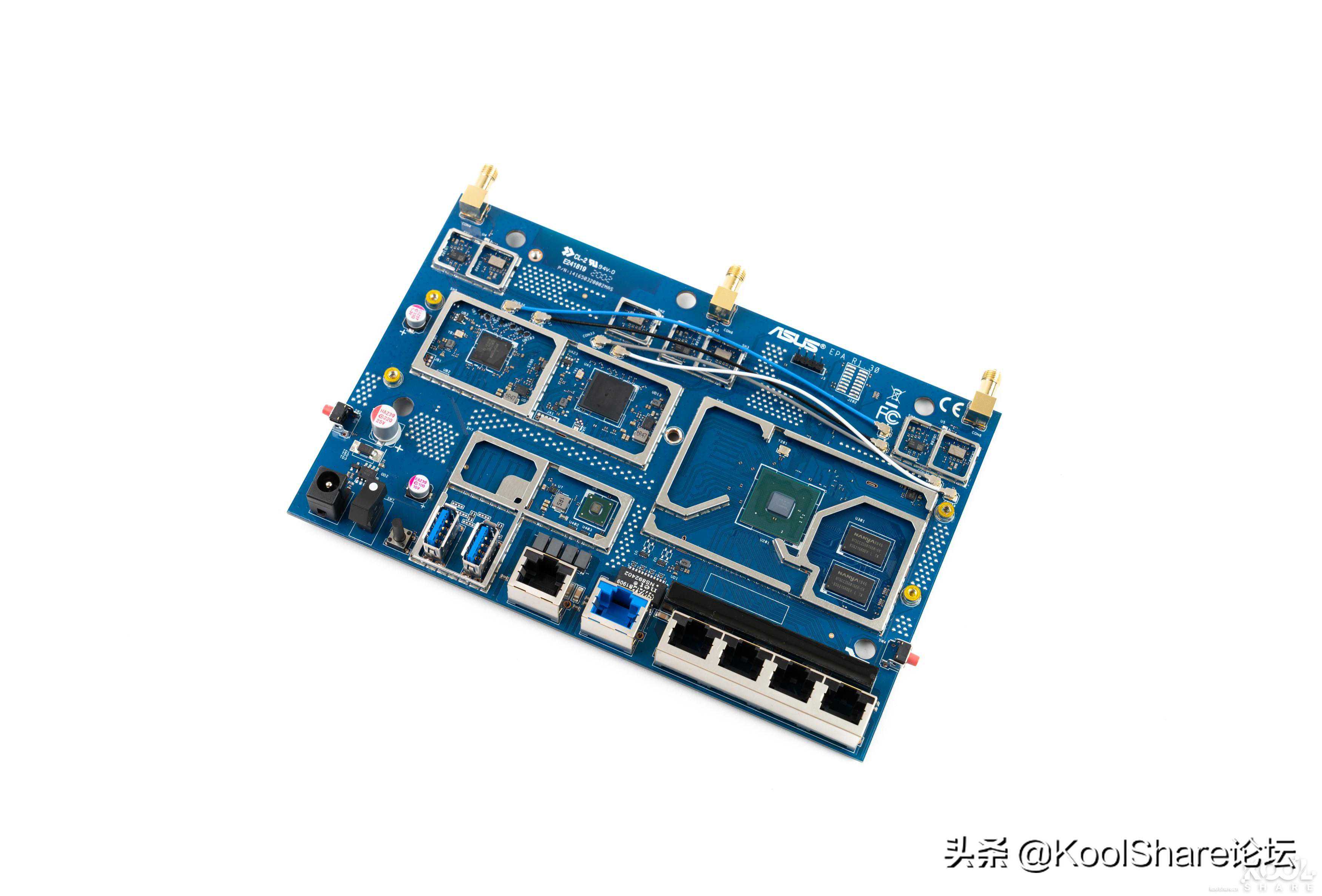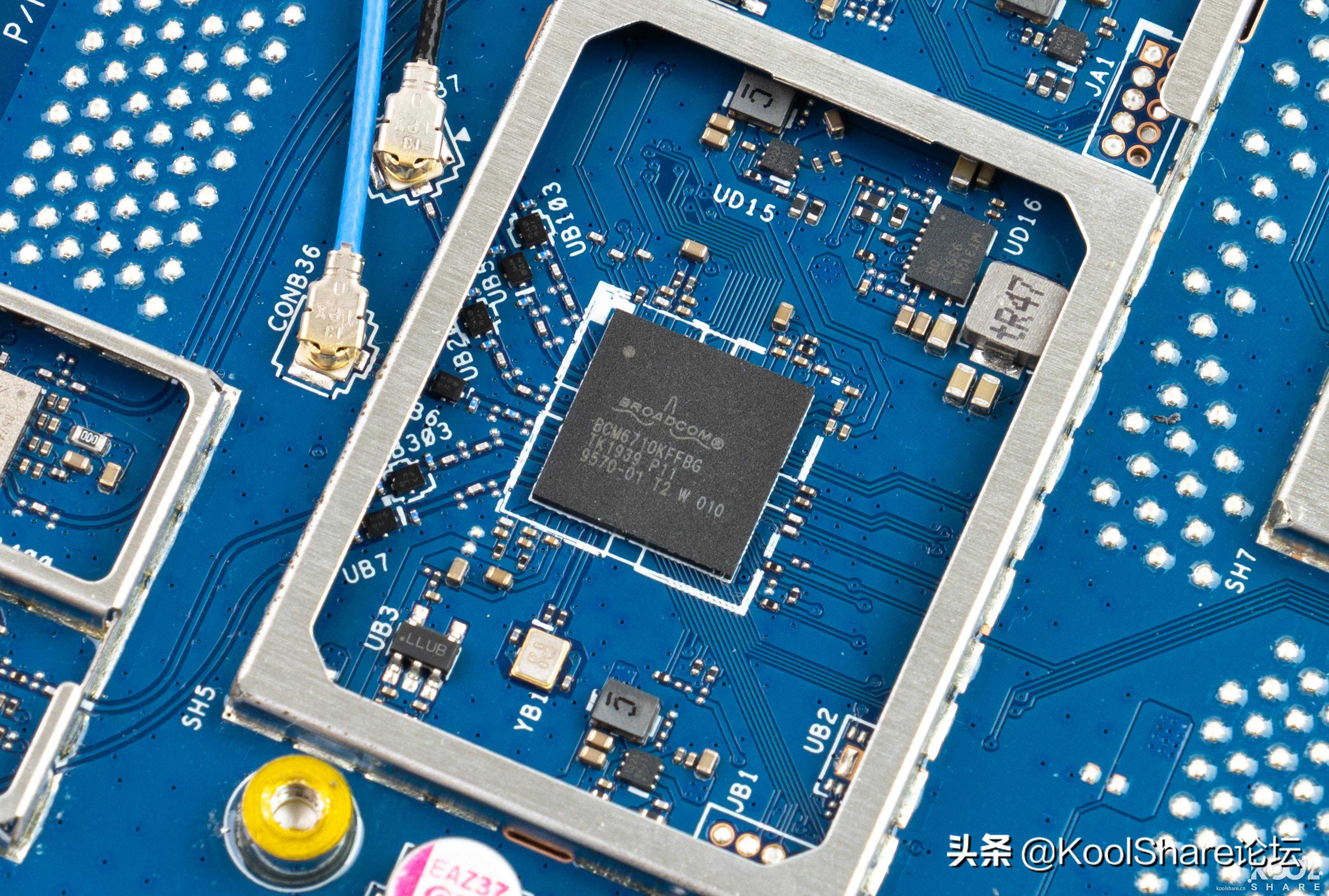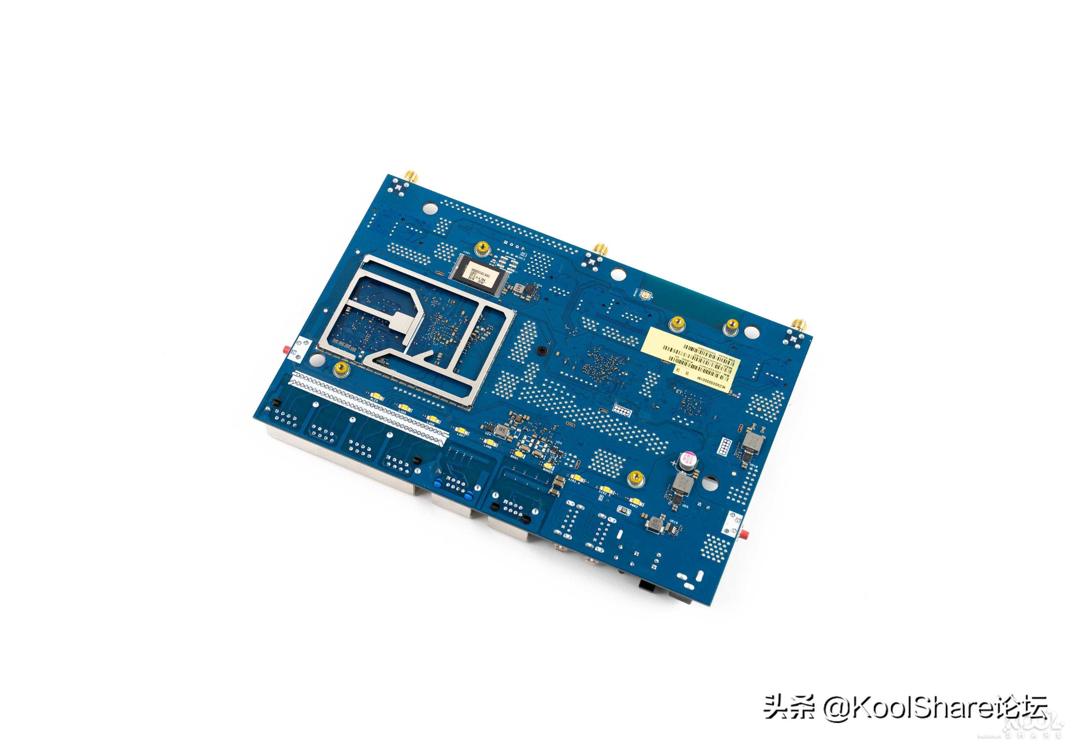 ▲去除PCB主板正面所有的屏蔽盖,就可以看到全部芯片了,最外围是无线功放,中间是无线芯片以及CPU核心区域,最里层则是IO接口