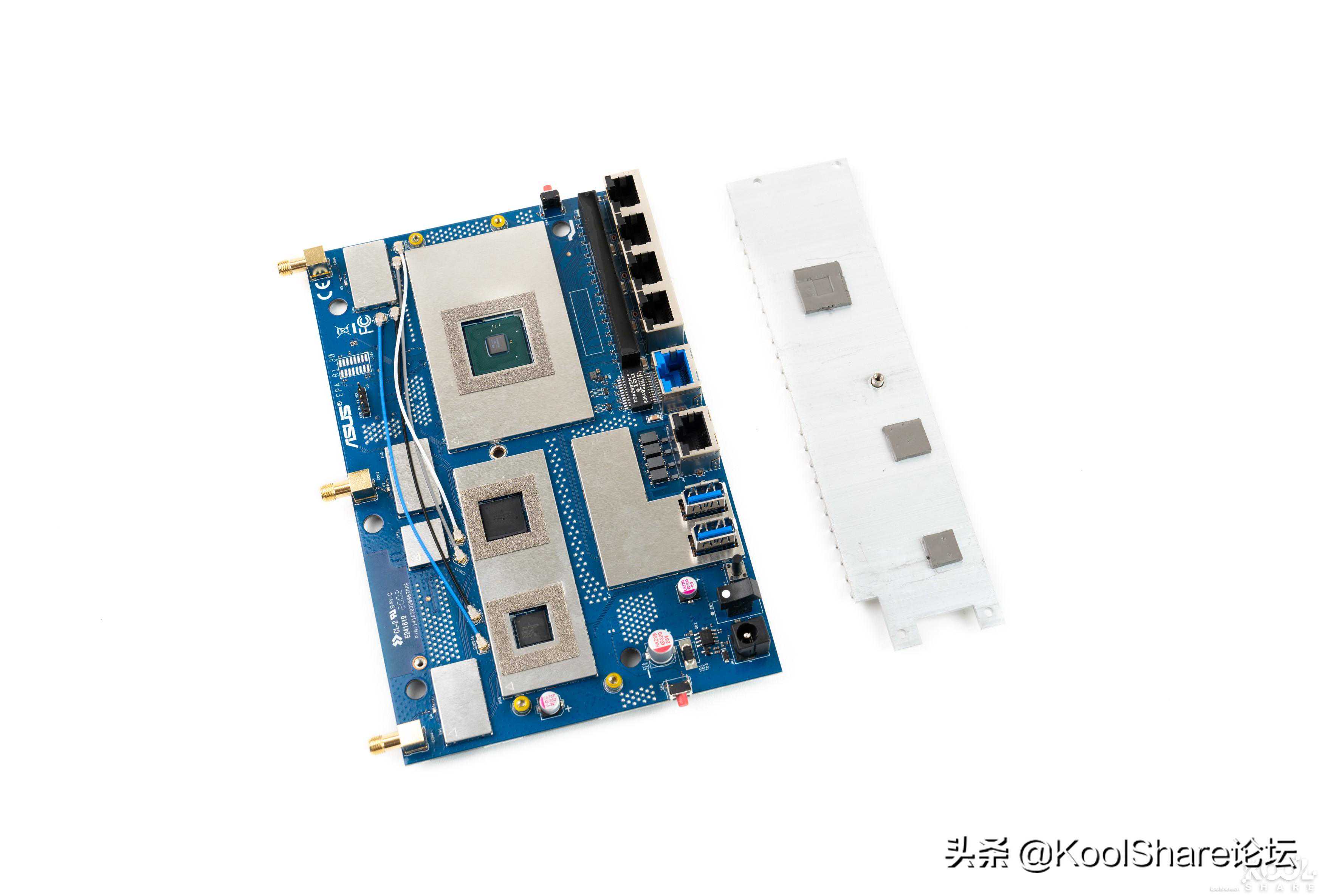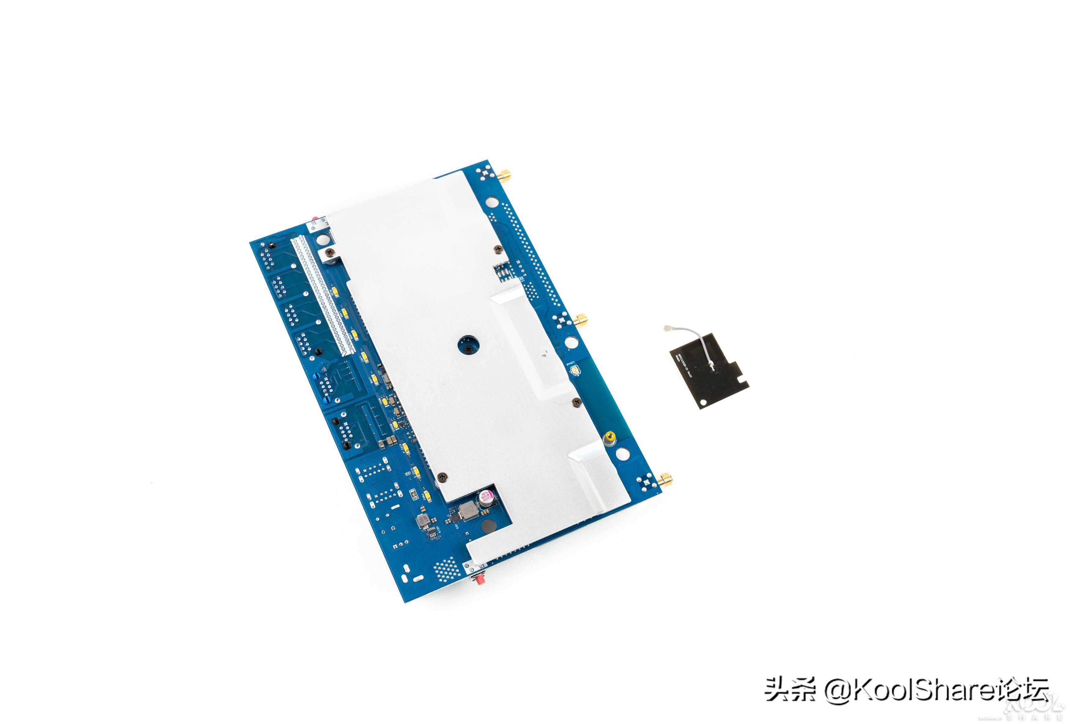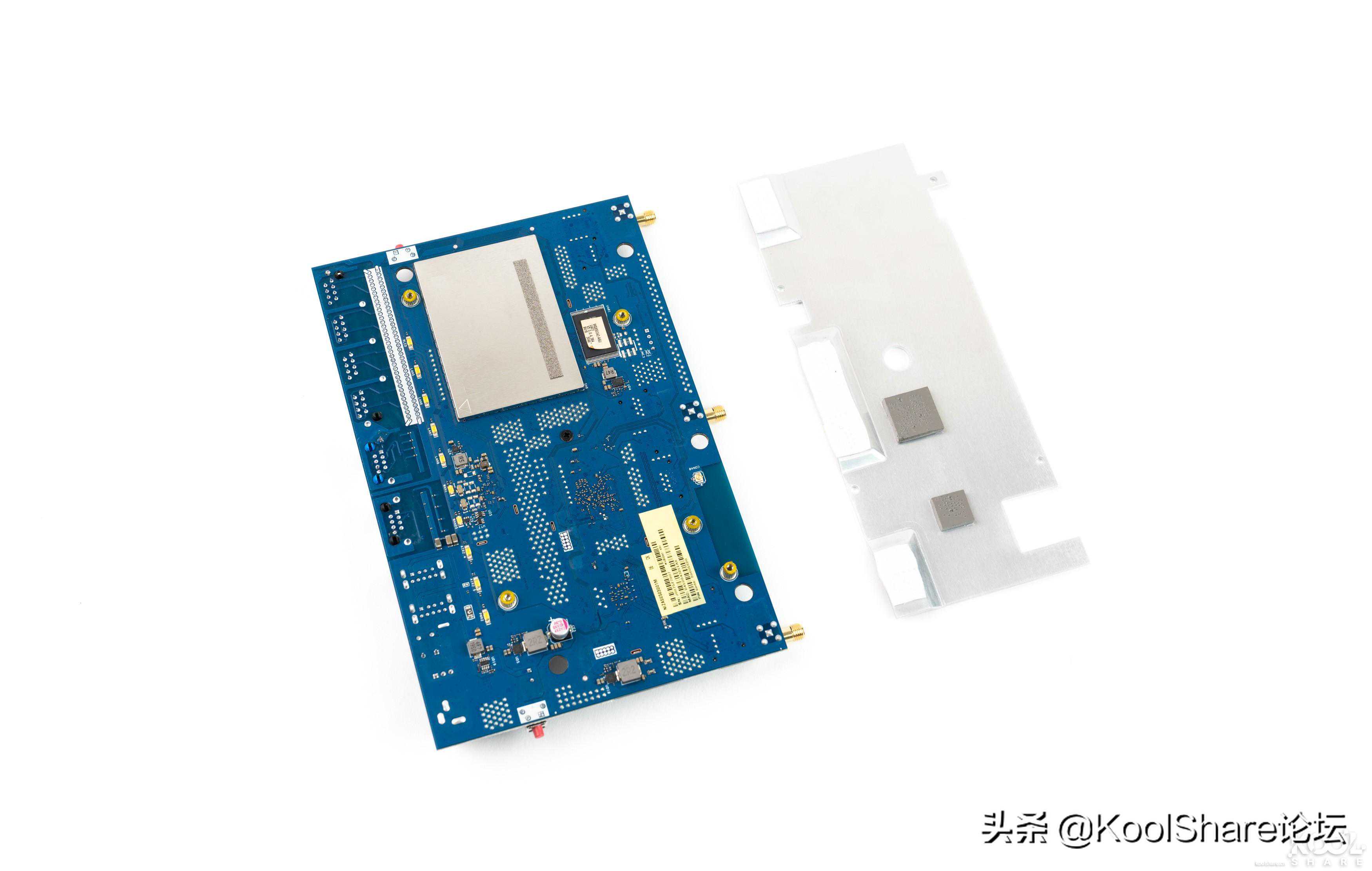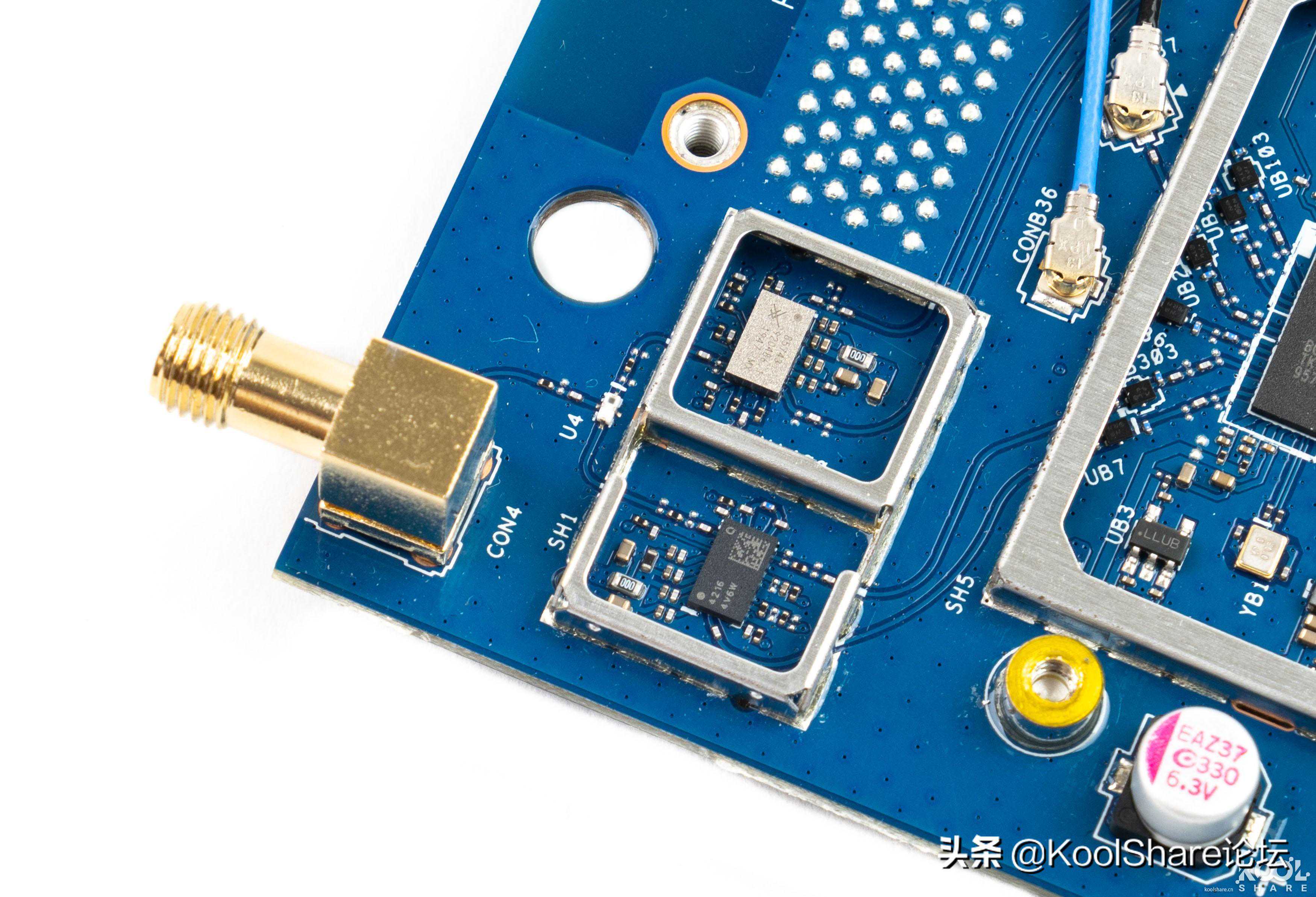 ▲去除PCB主板正面所有的屏蔽盖,就可以看到全部芯片了,最外围是无线功放,中间是无线芯片以及CPU核心区域,最里层则是IO接口