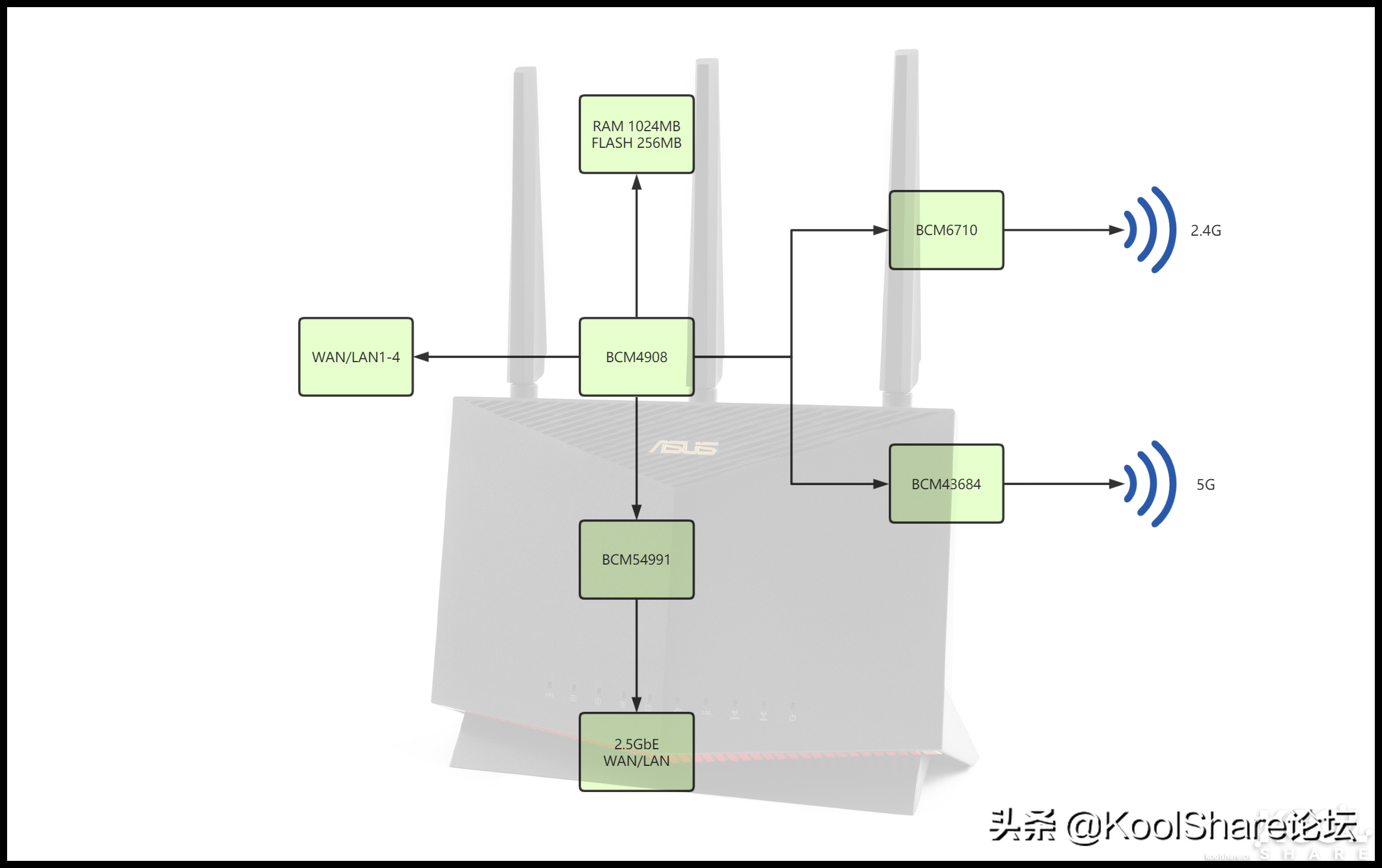 ▲BCM6710是3x3WiFi6Soc。该芯片可以选择性地在2.4GHz,5GHz和6GHz频段上运行。利用下行和上行OFDMA等技术,BCM6710可以提供更好的吞吐量。RT-AX86U将其作为2.4GWLAN芯片来使用