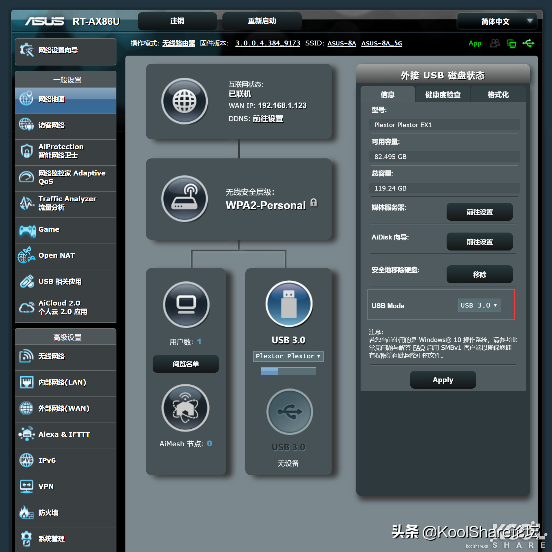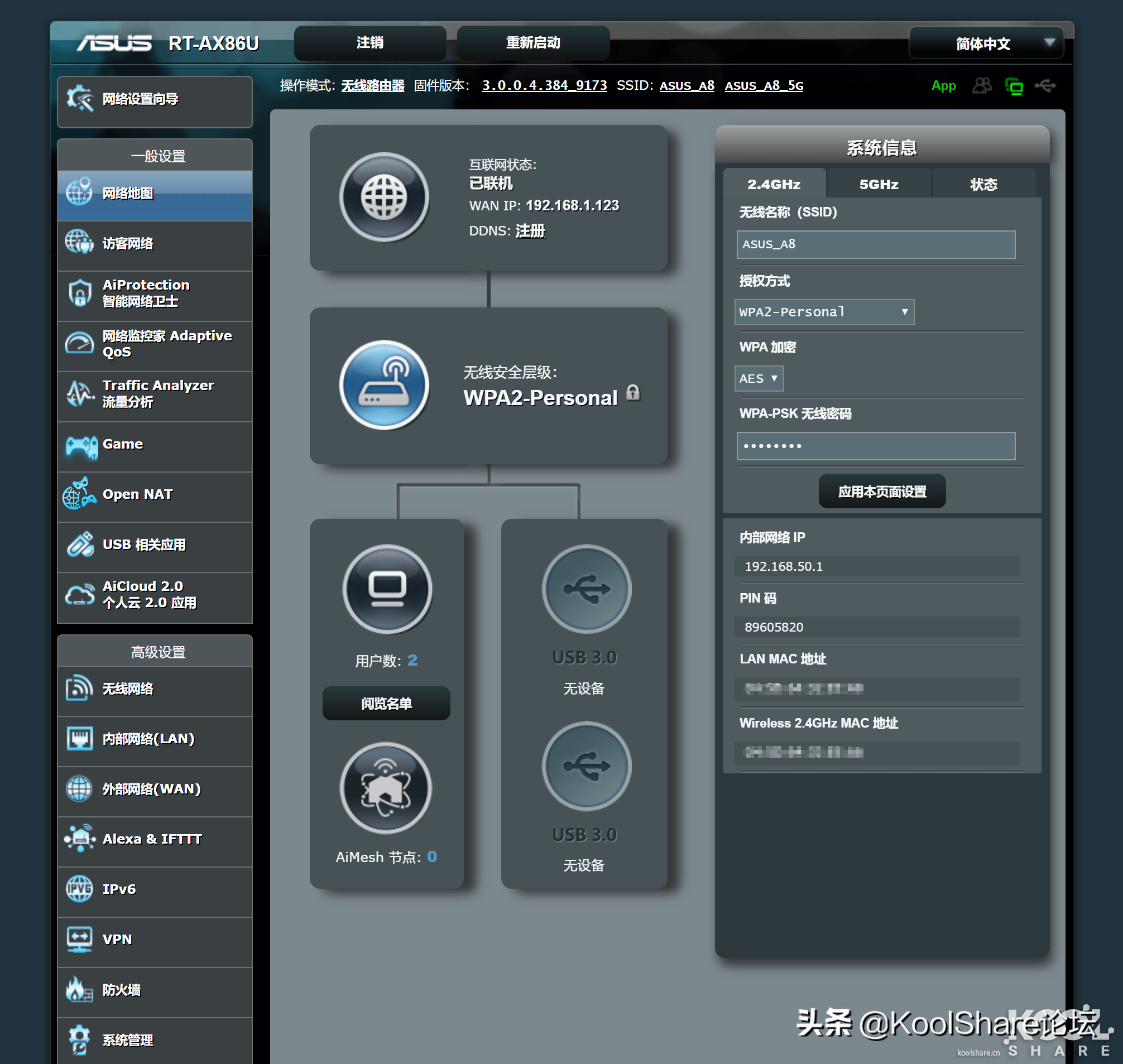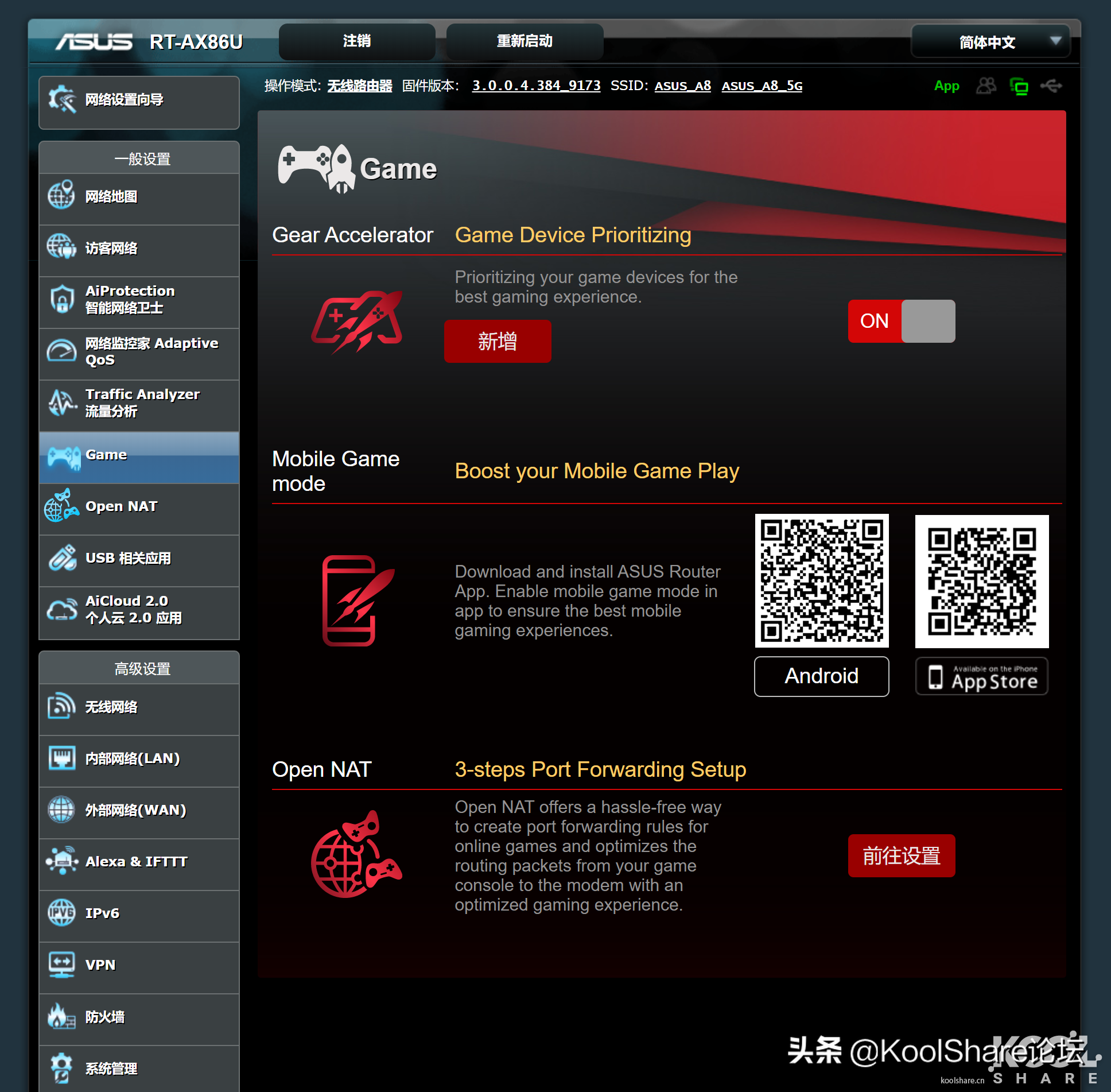 ▲查看RT-AX86U的固件版本,IP地址,连接用户数以及对其进行简单的设置更改都是非常容易的