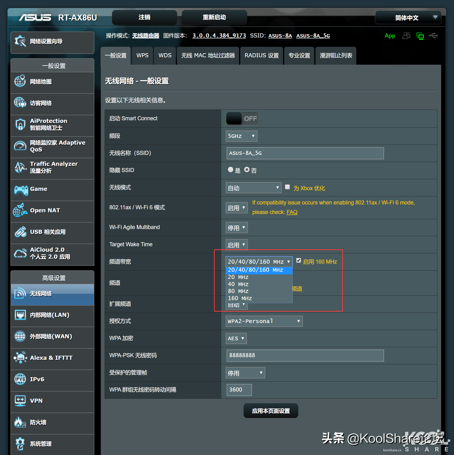 ▲在5G无线部分,RT-AX86U也是支持160MHz频宽的