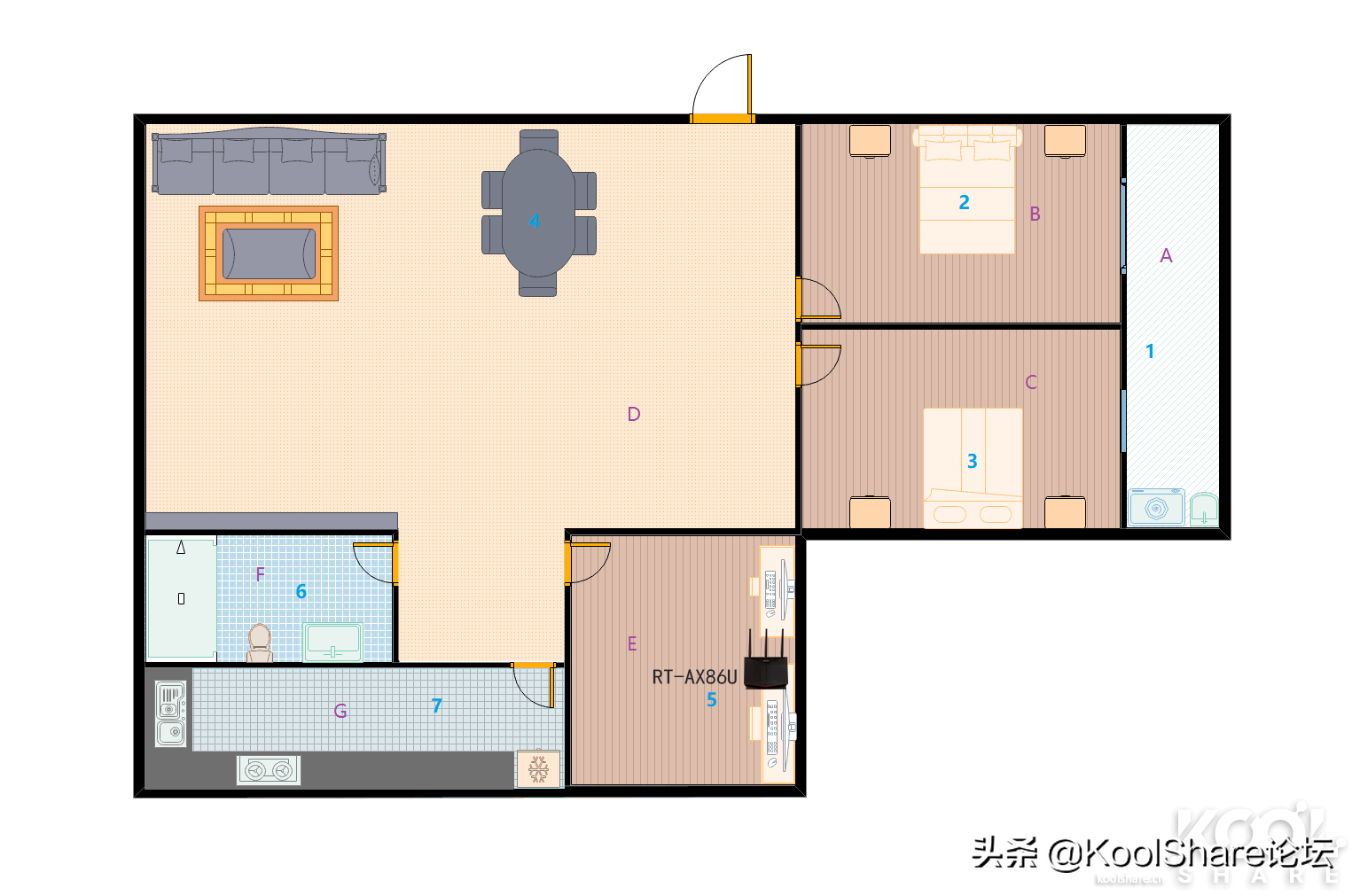 RT-AX86U无线地区为澳大利亚。其所在位置已在上图标出。各房间大致面积说明