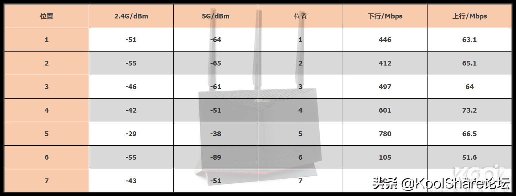 ▲1号位置处2.4G、5G信号强度以及Speedtest测试