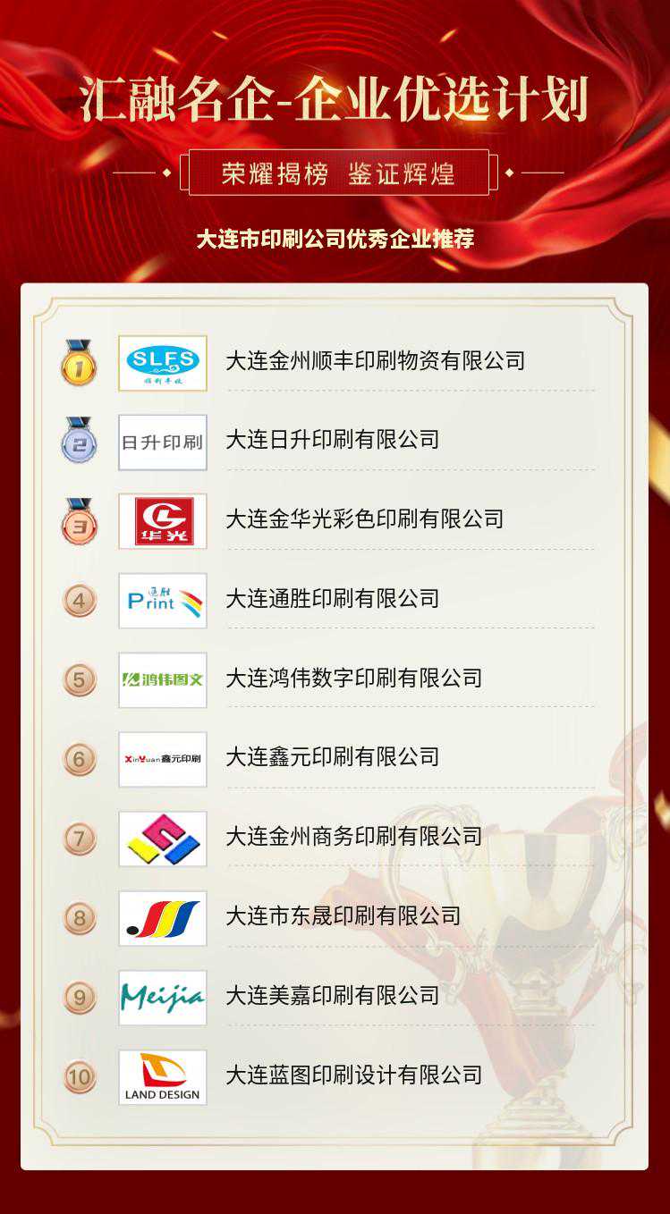 改革开放以来,我国各行各业都得到了飞速发展,印刷业发展的势头也日趋良好。汇融名企-企业优选计划,大连市印刷公司优秀企业推荐,以“承印天下,有求必达”为宗旨,目的是推动中国印刷行业发展,提升我国印刷行业内的良性竞争意识,促使我国的印刷公司的印刷技术再上一个新的台阶,树立印刷行业榜样,展示印刷行业风采,加强行业内学习交流,倡导印刷行业风范,提升印刷行业服务质量,甄选客户心中印刷行业的领军品牌,帮助客户寻找全城高品质的印刷公司,让客户有更多优质的选择。