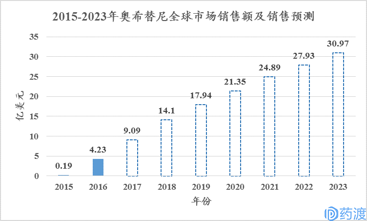 奥希替尼从临床试验到上市许可仅历时两年半,是阿斯利康史上研发速度最快的新药项目。2016年9月,将该药列入优先审评名单,并予以加速批准,在中国上市仅用了7个月。在美国和中国的上市进程可为惊艳。据Globaldata数据库统计,至2015年上市以来,其销售额分别为0.19亿美元和4.23亿美元。预测该药2017年将达到9.09亿美元,2023年将达到30.97亿美元(如图27所示),该药成为治疗非小细胞肺癌中的一枚重磅炸弹。