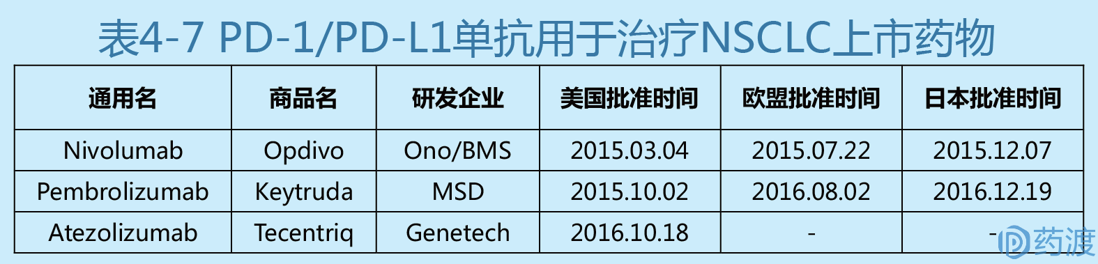 纳武单抗(Nivolumab)由小野制药和BMS联合研发,于2015年3月4日经FDA批准,EMA于2015年7月20日批准,2015年12月7日由PMDA批准在日本用于治疗处于铂类化疗期间或者化疗后的晚期转移性非小细胞肺癌和铂类化疗期间或化疗后转移性鳞状细胞癌。商品名Opdivo®。