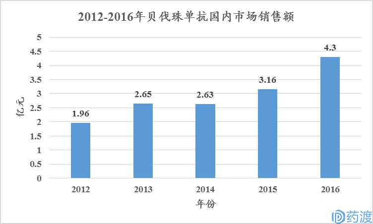 2010年,贝伐珠单抗经CFDA批准在中国上市,用于治疗转移性结直肠癌,2015年经CFDA批准用于治疗非小细胞肺癌。据PDB重点城市样本医院数据库统计,2012-2016年,贝伐珠单抗国内市场销售额分别为1.96亿元、2.65亿元、2.63亿元、3.16亿元和4.30亿元(如图45所示),年增长率分别为35.2%、-0.8%、20.2%和36.1%。除2014年,其余均呈现显著增长的趋势。
