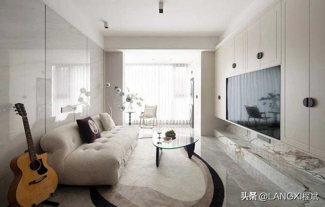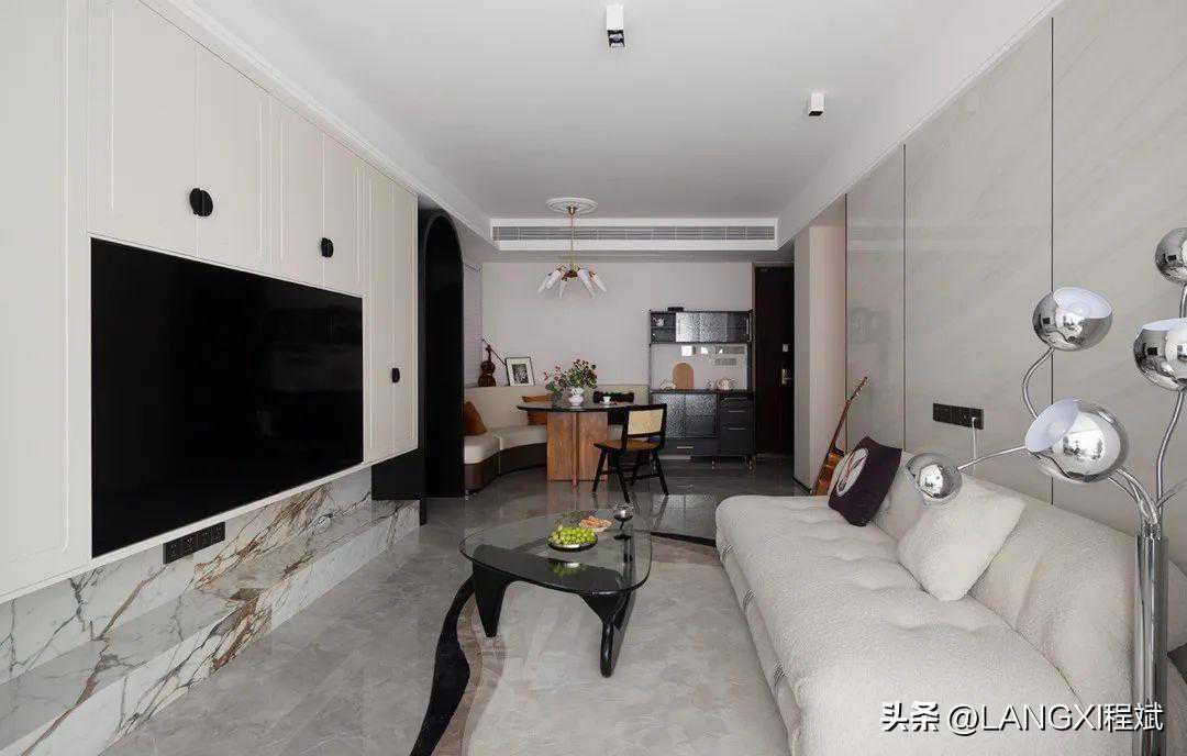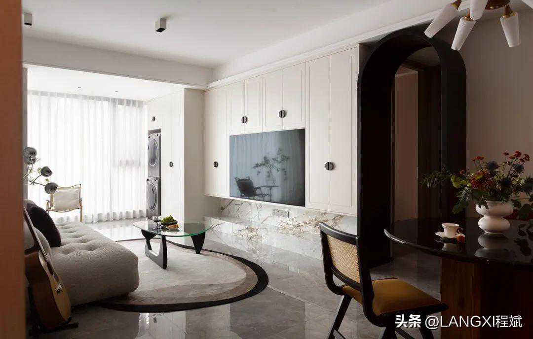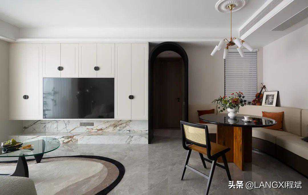 在电视背景墙区域,我们用整面柜体打造出舒适简约的嵌入式背景墙,用半圆黑色拉手,来表现法式元素。