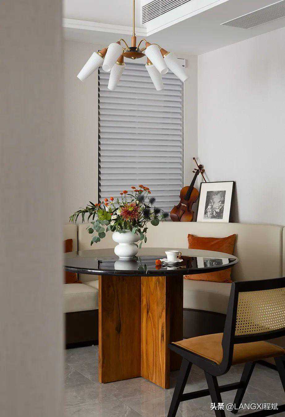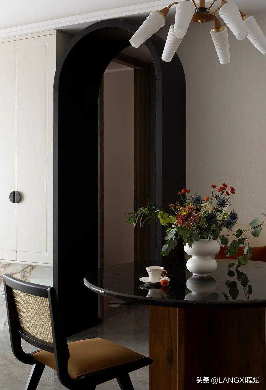 在软装搭配上,我们用深色石材做餐桌桌面,法式复古的玻璃吊灯组合起来,精致又沉稳,弥漫着法式独有的韵律,连餐椅都是一股扑面而来的优雅。