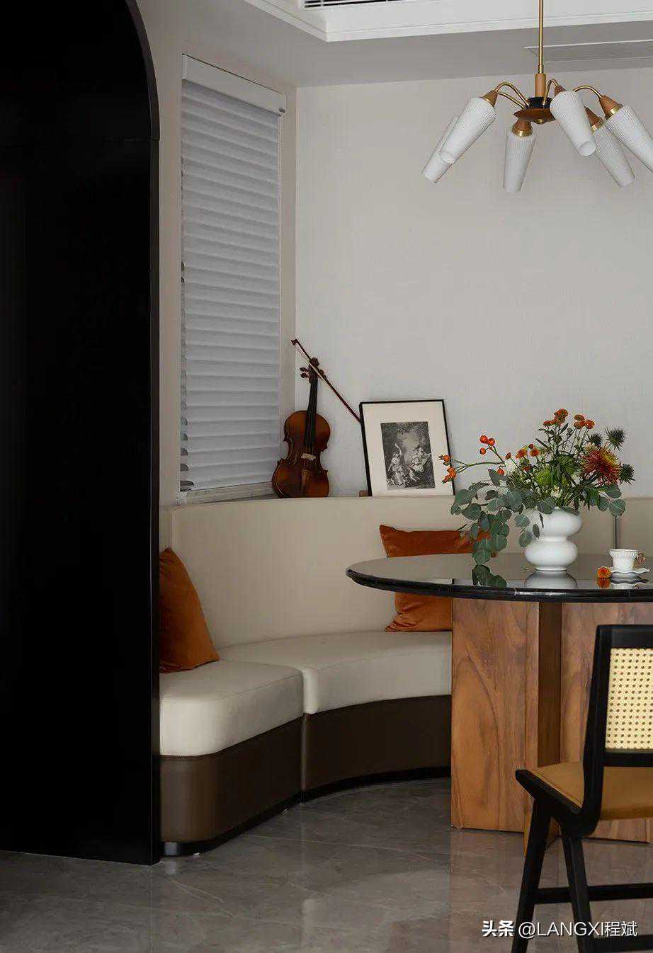 入户即是餐厅区域,简洁利落的弧形门洞是业主赋予空间的专属浪漫,加入卡座设计后的餐厅,让空间在动线上更为流畅舒适。