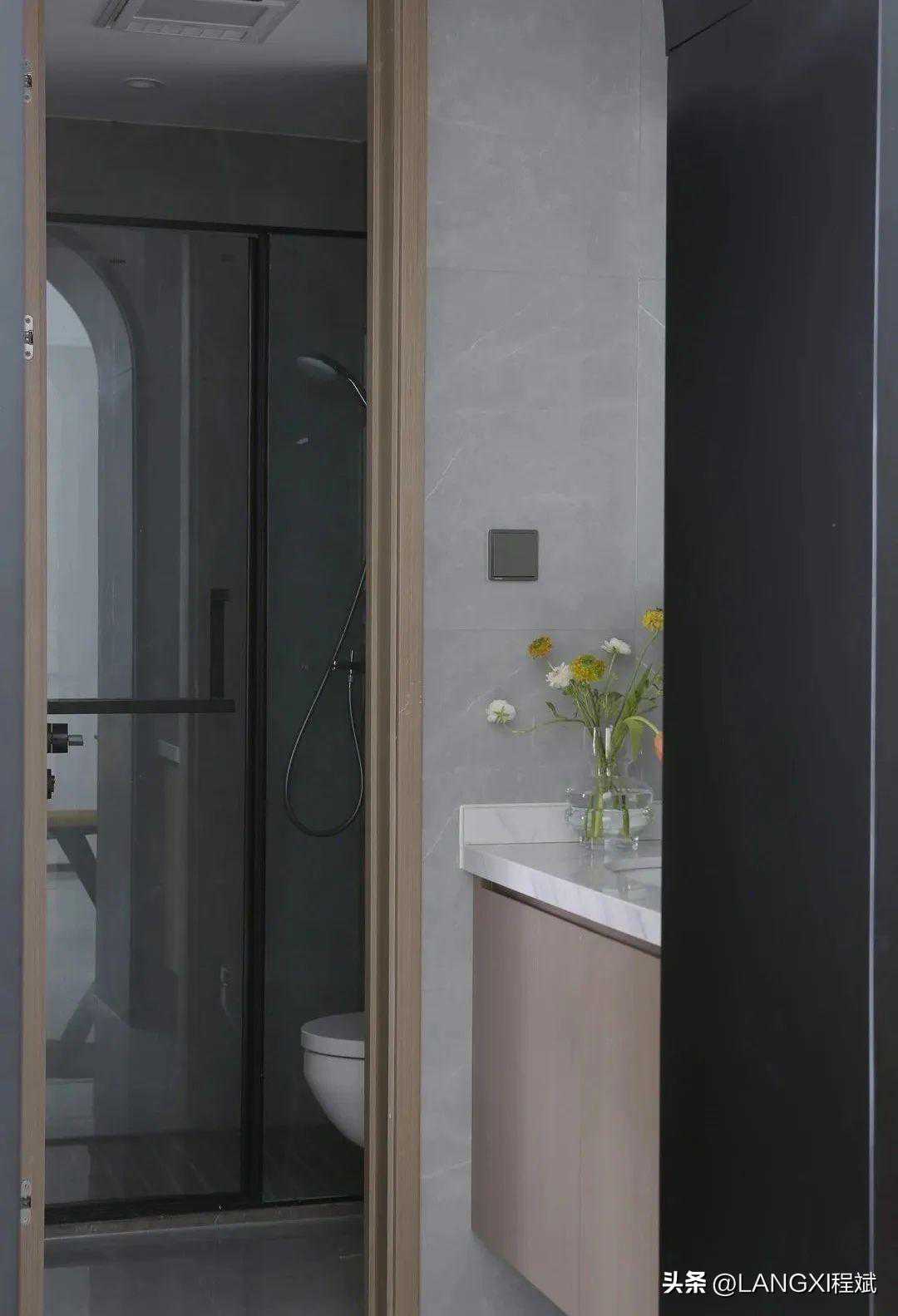 卫生间区域内部用玻璃断隔出淋浴区和马桶区,实现干湿分离,既减轻卫生清扫的负担又让功能分区更为明确,洗手台做悬浮设计,不留卫生死角方便清洁,二来呈现出更为轻盈的视觉效果。