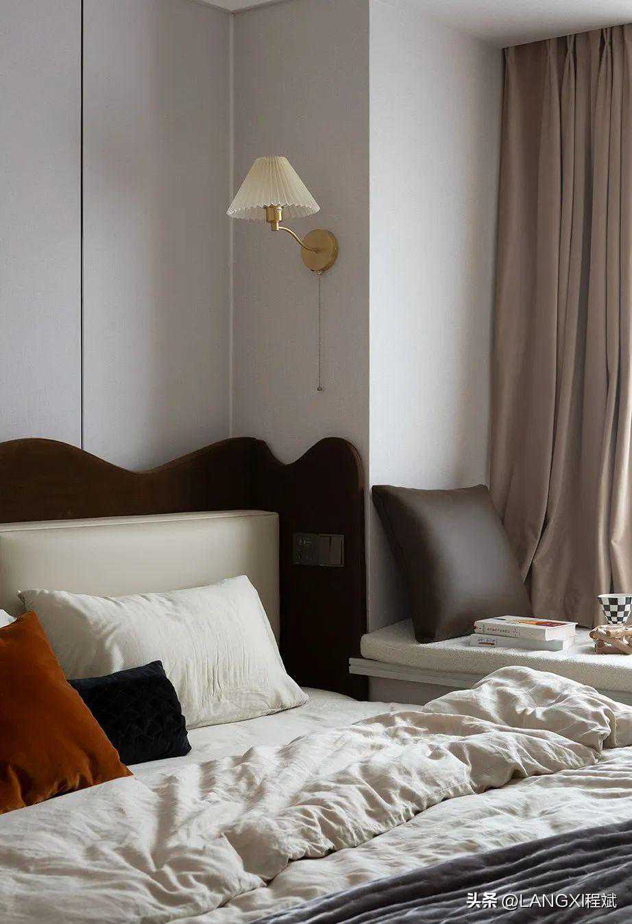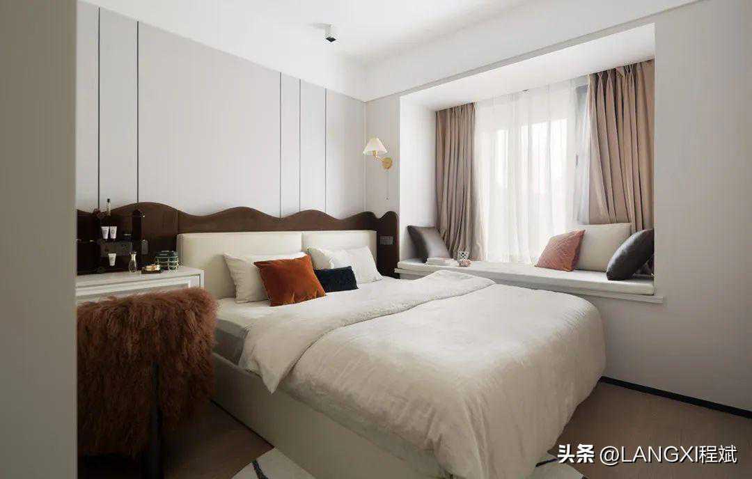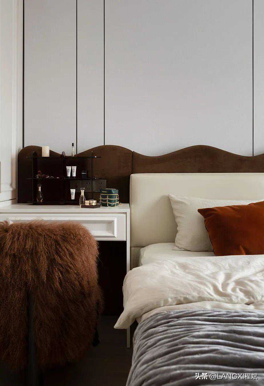 主卧的设计显得更有一派静谧氛围,波浪形床头背景墙闯入浅灰色的世界,为其注入柔情,化作独特的风景线。