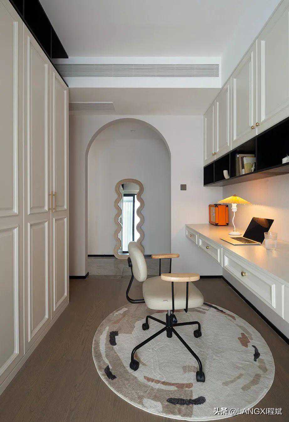 在原始户型中,书房的空间原本是一间卧室,我们将卧室打通之后连接阳台,形成一个开放式的书房格局,同时利用弧形门元素将空间的造型感加强,整面墙的柜体设计,让空间有足够的收纳空间。