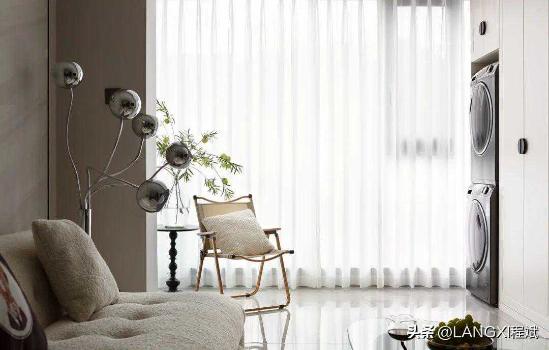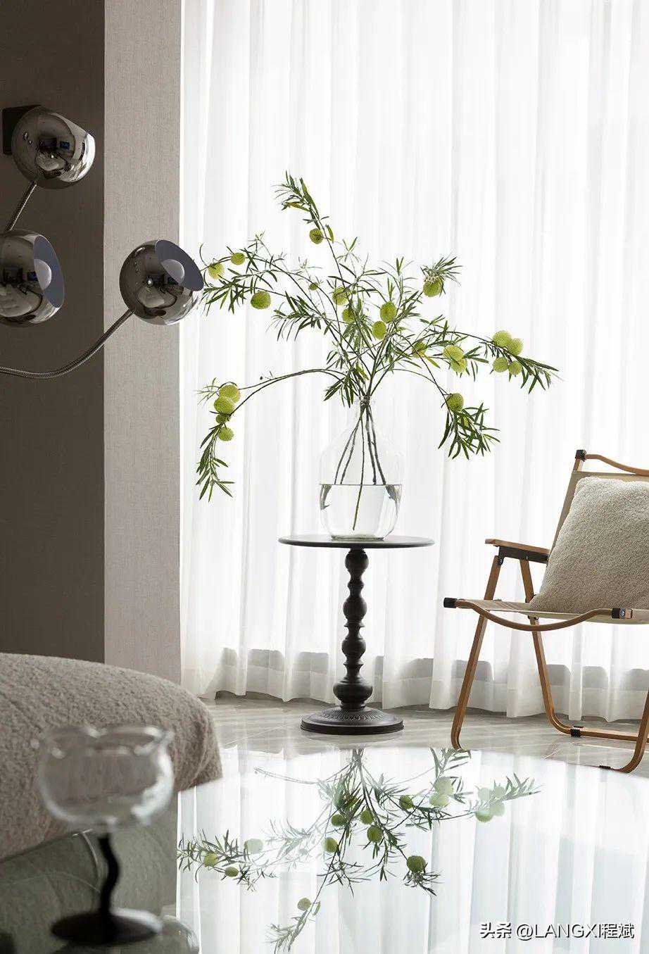 具有半透光效果的纱质窗帘,让日光变得更柔和。在被完全释放的阳台中,一束花,一支桌,一把椅就足够承载无数种舒适可能。