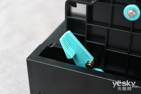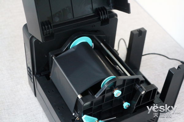 2、打开碳带仓盖,将碳带供应轴装至碳带供应端(一共两组卡槽,碳带供应轴在右下侧卡槽)。