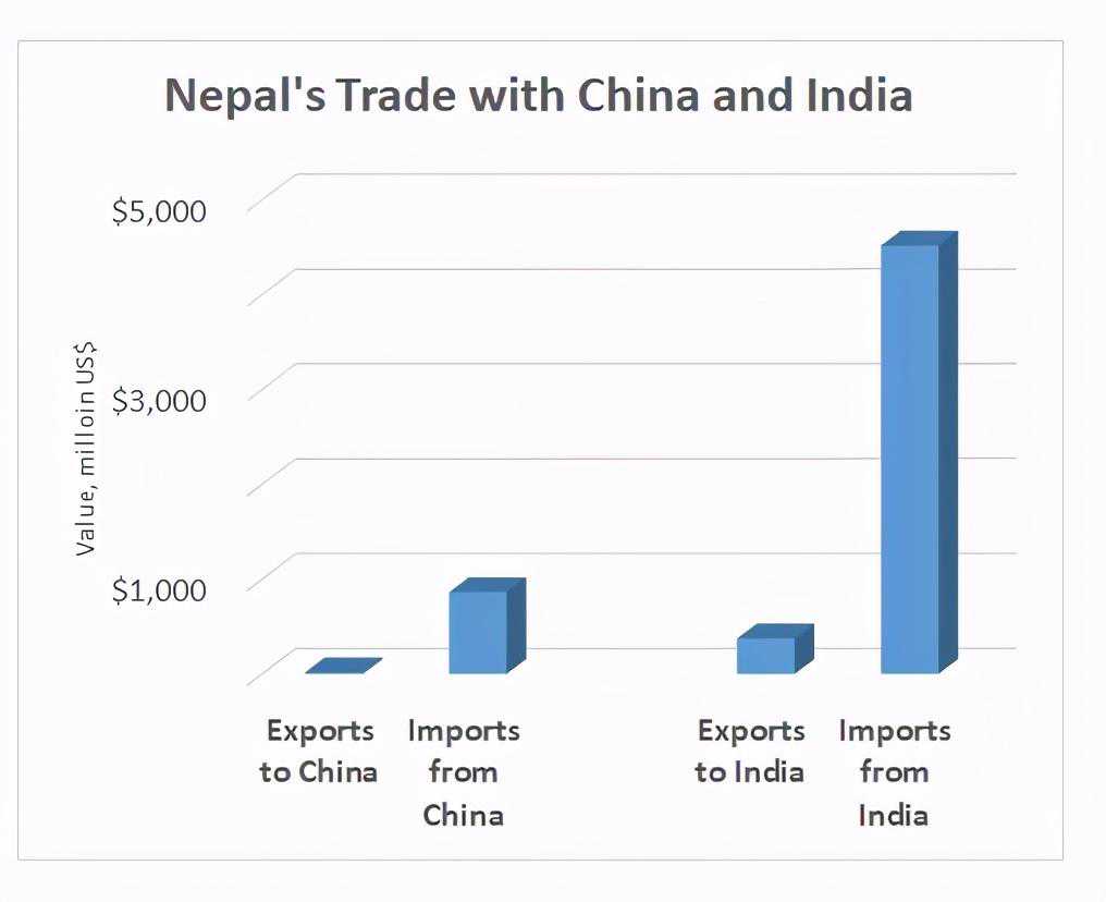 尼泊尔作为一个纯内陆国家,从古至今夹在中、印之间,但尼泊尔在东、南、西三面被印度包围,北部和中国西藏被喜马拉雅山脉阻隔,交流不便,加上远离出海口,所以尼泊尔在外贸易领域严重依附于印度。