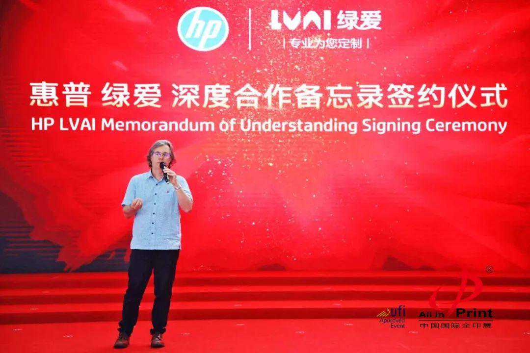 会议伊始,惠普公司Indigo数字印刷事业部副总裁兼总经理AlonBar-Shany、绿爱股份董事长兼CEO郭建波分别发表了致辞,表达了对达成深度合作的祝贺及期待。
