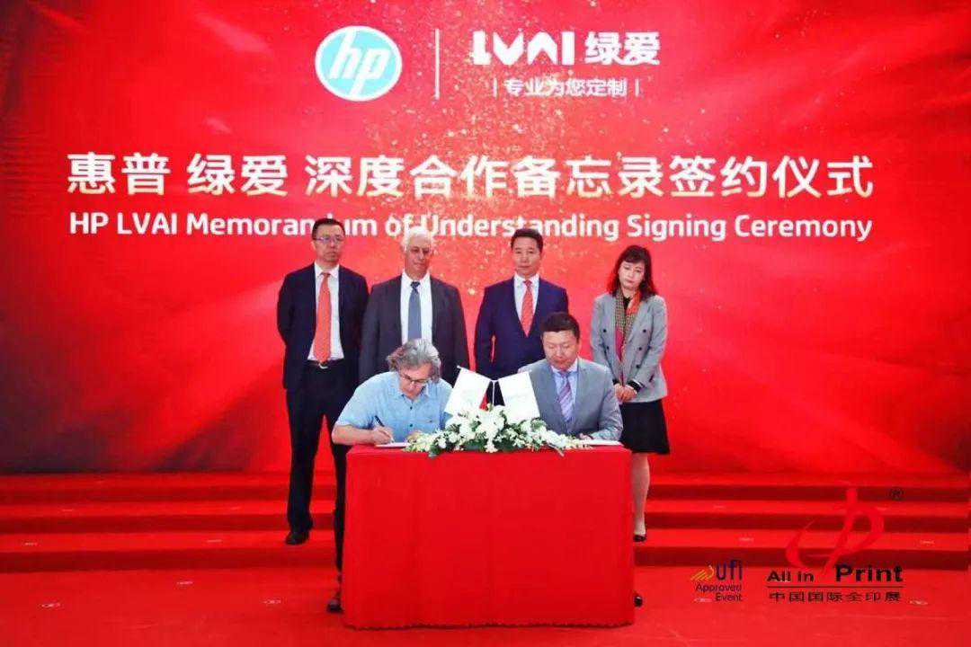 惠普公司Indigo数字印刷业务部副总裁兼总经理AlonBar-Shan先生与绿爱股份董事长、CEO郭建波先生,经纶全讯科技有限公司总裁刘涛先生与郭建波先生,分别签署合作协议,惠普公司Indigo数字印刷事业部副总裁兼业务顾问EzuzShabtai、惠普公司Indigo数字印刷事业部中国区总经理李鹏、惠普公司Indigo数字印刷事业部亚太区软包装业务经理钱怡雯、惠普公司Indigo数字印刷事业部中国区软包装销售总监冯汉荃作为助签嘉宾共同见证惠普与绿爱股份战略合作的达成。