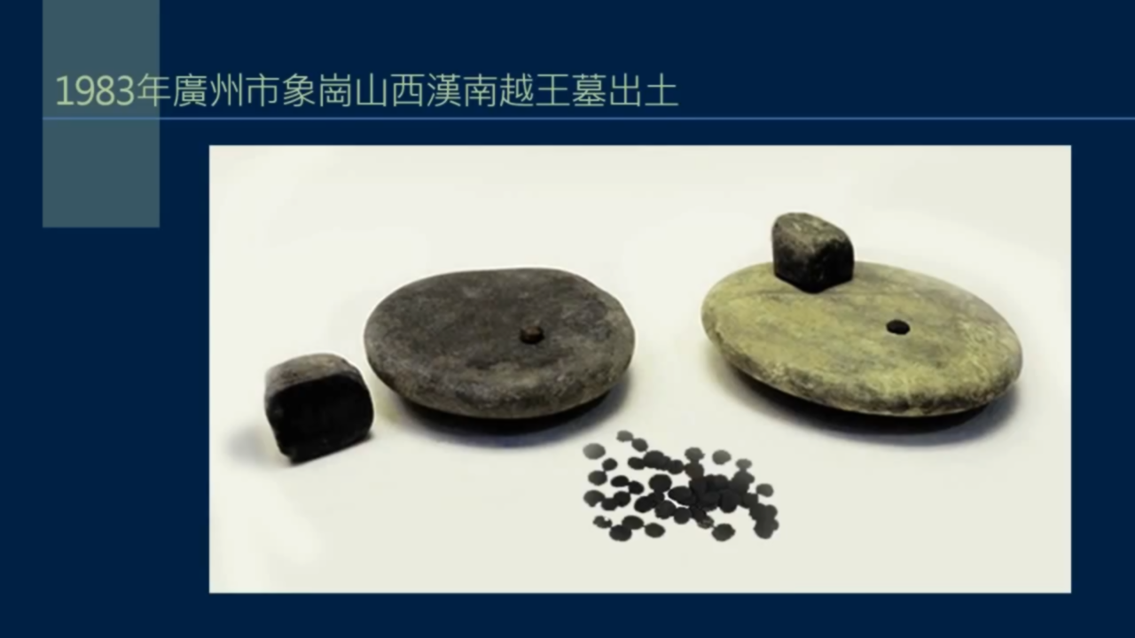 1983年,廣州市象崗山西漢南越王墓出土了三方硯,這是其中的兩方,此外還出土了4300粒墨丸。1973年山西還發現過春秋時期製作的石硯和墨丸,時代很早。在硯台上放幾粒墨丸,和水一起,就可以磨製墨汁。想起來孔子、老子、莊子,大約也是用類似的方法吧。