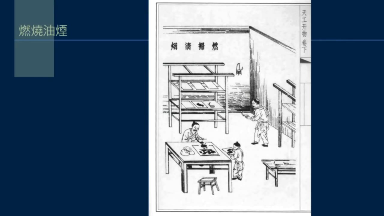 ■古法惟用松燒煙,近代始用桐油、麻子油燒煙。衢人用皂青油燒煙,蘇人用菜子油、豆油燒煙,以上諸油俱可燒煙製墨。這樣我們知道了,明代普通就是燒桐油、麻子油、皂青油、菜子油、豆油,其實還有豬油、漆油等。
