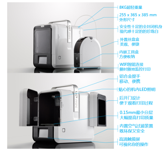 除上述重要功能以外,UPmini2还设计了全新的时尚外观,放在家中或工作室,增添现代感;同时增加了机内LED照明装置,便于用户监控打印过程。UPmini2外形尺寸约为255x365x385mm,重量8KG。