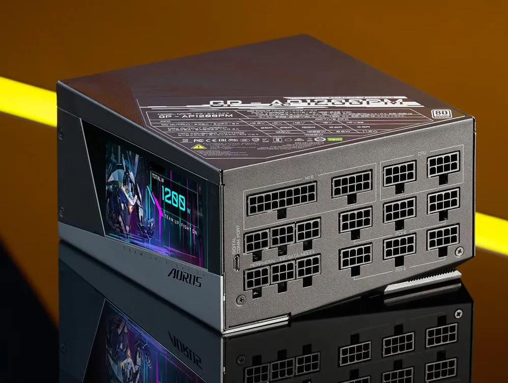 ▲技嘉铂金雕AP1200PM电源通过80PLUS白金牌能效认证,并采用全模块化设计,配备高品质全日系电容,数字液晶显示屏和技术的加持更是锦上添花。