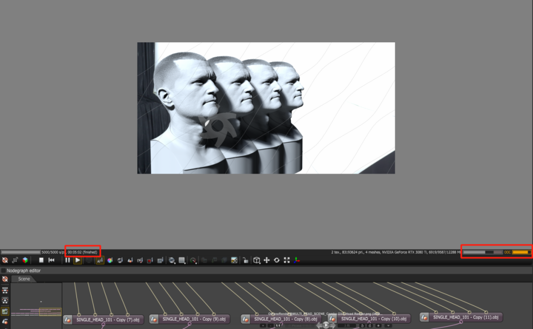 在OctaneRer中进行超大模型MULTI_HEAD_SCENE的渲染时,技嘉RTX3090TiGamingOC魔鹰24G无需调用内存作为显存使用,即可耗时不到70秒完成渲染任务,而RTX3080Ti则由于显存容量不足,需要调用部分内存作为显存进行核外渲染,并且耗时长达5分钟。