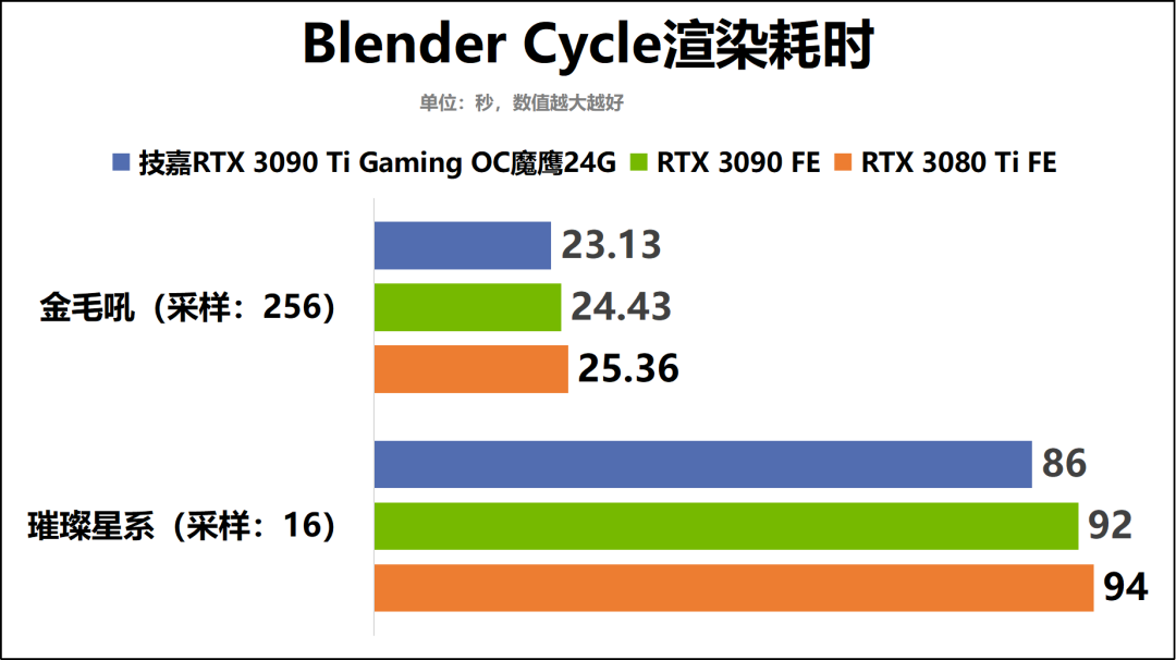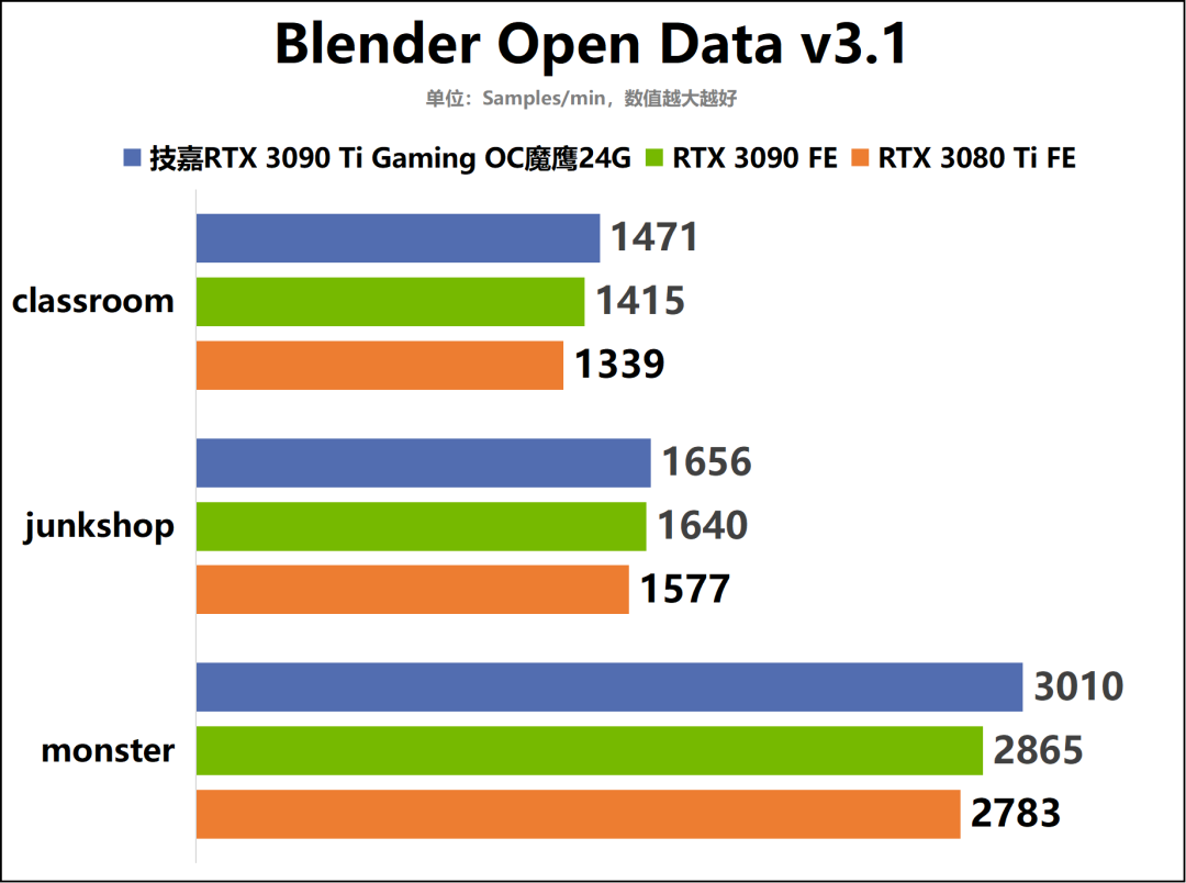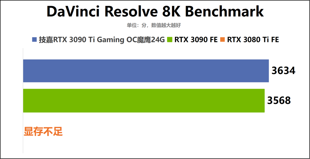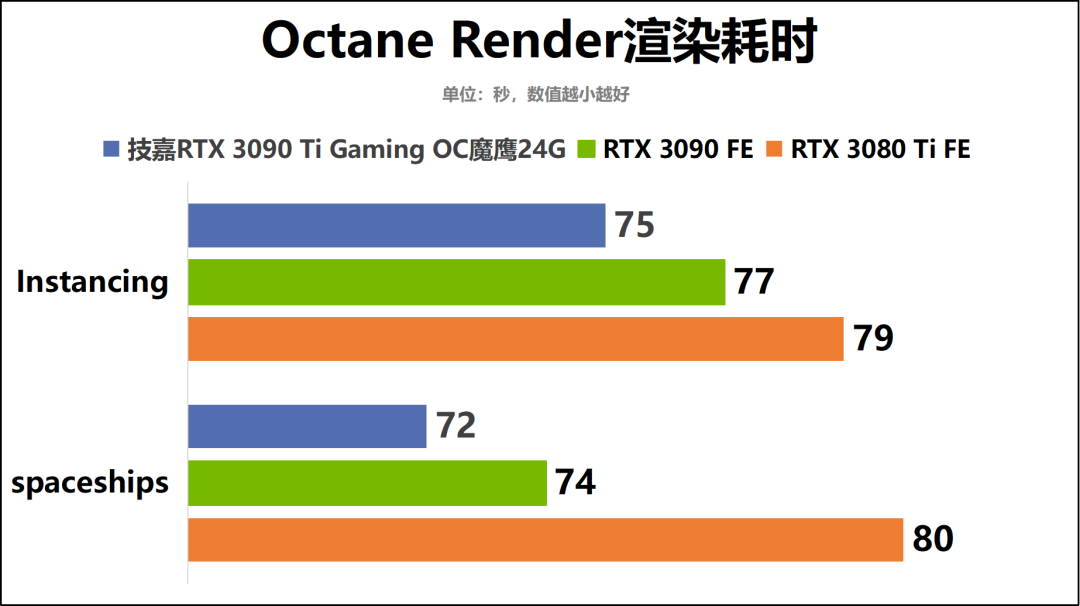 随后,我们还针对技嘉RTX3090TiGamingOC魔鹰24G在内容创作领域的表现,进行了更深入地测试。同时还将其测试结果与RTX3090FE和RTX3080Ti进行对比,从而让大家对其创作性能水平有更直观的认识。