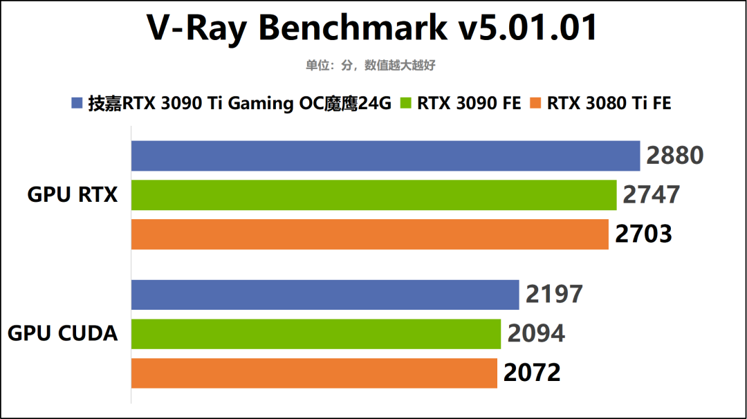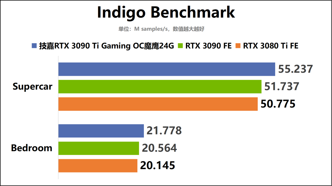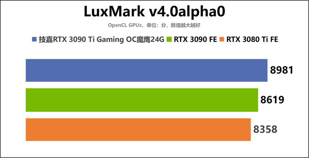 通过我们的测试成绩可以看到,技嘉RTX3090TiGamingOC魔鹰24G在创作性能上的优势还是非常明显的。综合来看,这款非公版RTX3090Ti显卡相对RTX3090FE领先约5%,同时其性能还在RTX3080Ti的基础上提升8%左右。