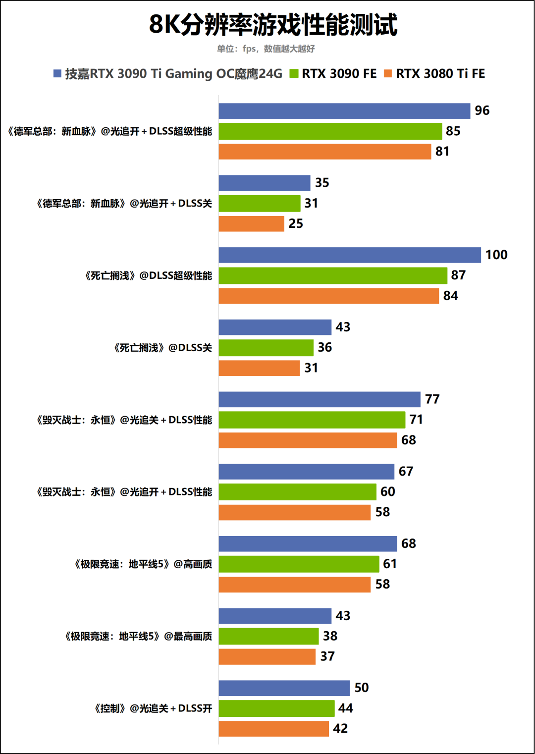 4K分辨率游戏性能部分的测试结果也非常喜人。如开启光线追踪,DLSS统一设为平衡模式,并将游戏分辨率设为最高等级后,技嘉RTX3090TiGamingOC魔鹰24G完全可以流畅运行多数参测游戏。如《死亡循环》《德军总部:新血脉》在上述设定下的平均帧率逼近甚至超过144fps这一电竞级绝对流畅帧率。而在和其他两款参测显卡的对比上,技嘉RTX3090TiGamingOC魔鹰24G的综合游戏性能领先RTX3090FE约13%,相对RTX3080Ti的领先幅度更是达到16%。由此可以看出,技嘉RTX3090TiGamingOC魔鹰24G不仅在内容创作领域的表现出类拔萃,在4K甚至8K分辨率游戏领域同样是“天花板”一般的存在。
