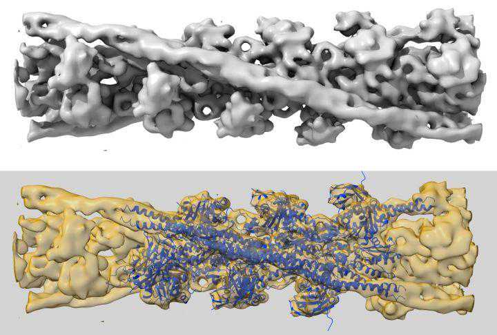 蛋白质的结构非常复杂,当然也包括我们的肌肉。人肌肉里的蛋白质是大量氨基酸构成的生物大分子物质[54][55][56][57],人肌肉的肌球蛋白(及其结合物)在仪器的眼光下看上去长这样。