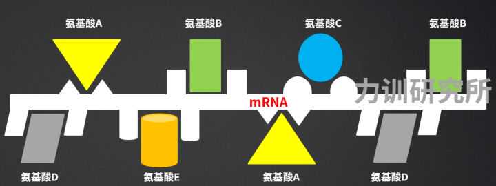 mRNA如同一条链子,上面预留了不同类型的氨基酸的结合区(密码子)。身体把大量的氨基酸运输过来,每个氨基酸可以对号入座,“组装”到这条链子上。