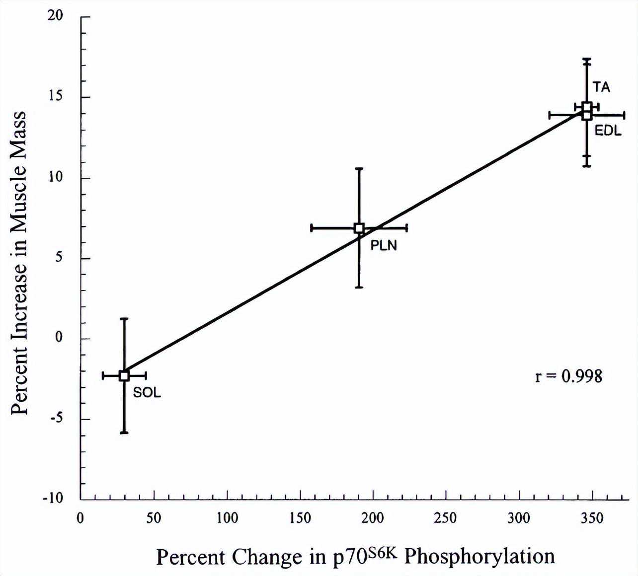 研究发现,S6k它的磷酸化水平与增肌之间,存在极强的正相关性,r=0.998。下图纵轴是肌肉增加的幅度,横轴是s6k磷酸化水平,用俗话来说,它们几乎成正比。
