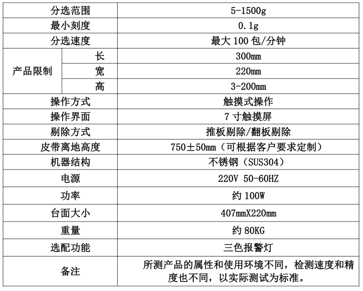 报警方式:声光报警、停机、剔除可选配
