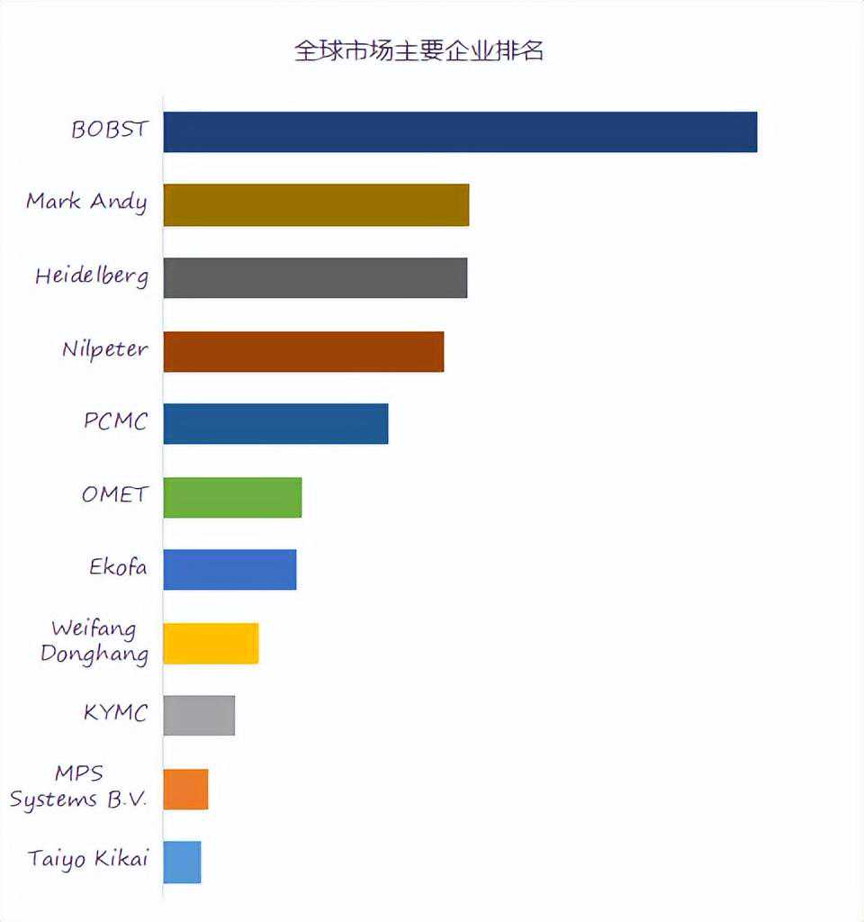 全球范围内机组式柔印机生产商主要包括BOBST、MarkAndy、Heidelberg、Nilpeter、PCMC、OMET、Ekofa、WeifangDonghang、KYMC、等。2021年,全球前五大厂商占有大约67.0%的市场份额。