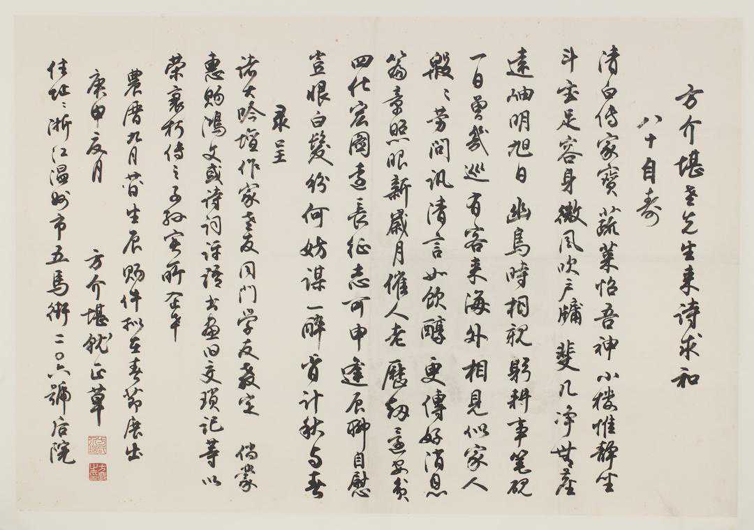方介堪书八十自寿诗并索和启事,52×75.8cm,1980年
