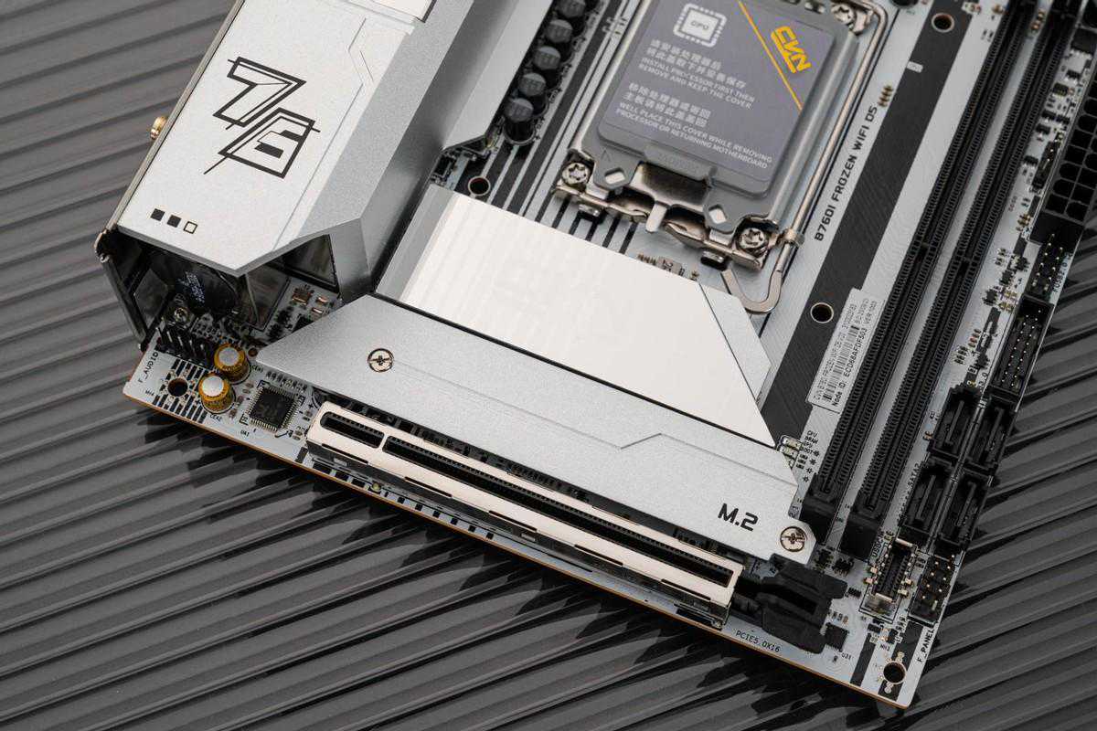 供电部分,七彩虹CVNB760IFROZENWIFID5V20登陆舰主板采用7+1+1相数字混合供电设计,90核心供电能够轻松应对酷睿14代高端型号苛刻的供电需求,确保处理器能够火力全开。为了应对供电部分的发热,主板为供电、存储、芯片组等高热量区域配备了高导热硅胶片,提升热量的传导效率,再通过大面积的CVN凝霜散热装甲进行散热。值得一提的是,在散热装甲下方还隐藏有可控速散热风扇提供辅助散热,确保主板长时间、高负荷运行的稳定性。
