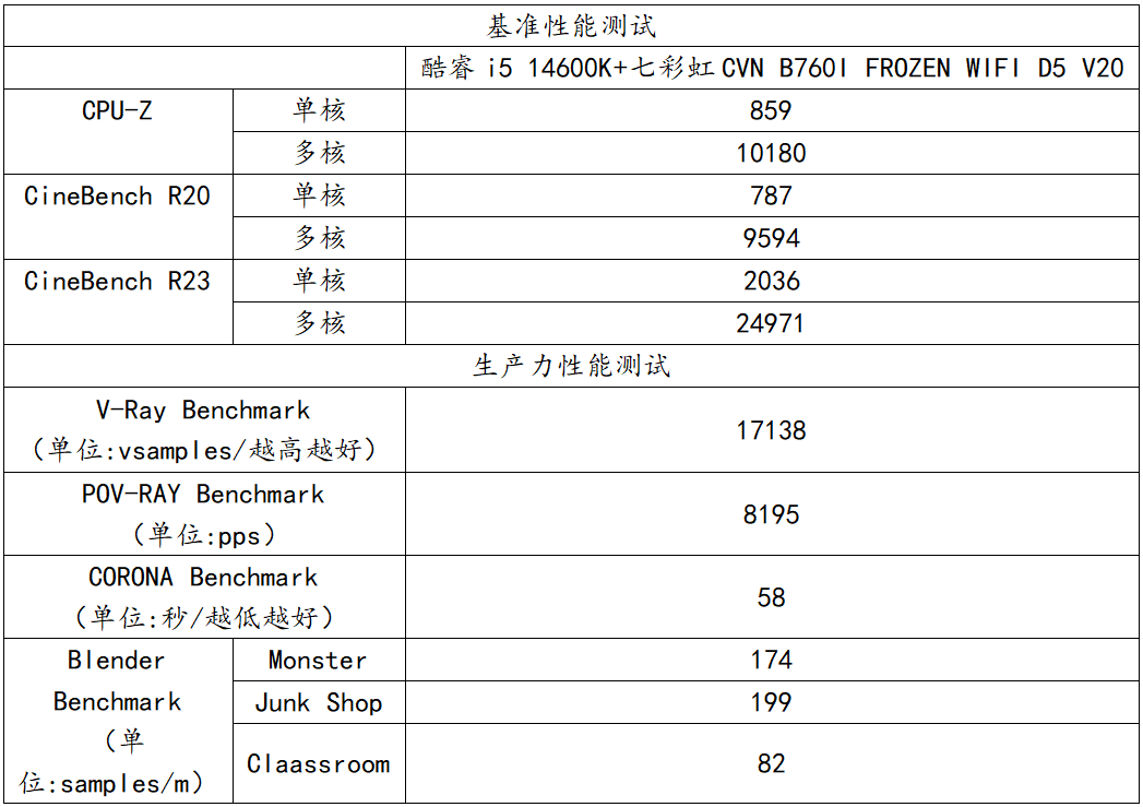 在处理器基准性能测试中,酷睿i514600K在《CPU-Z》《CinebenchR20》《CinebenchR23》中的跑分数据和搭配Z790主板时相当,表明该主板可以将处理器性能充分地释放出来。而在生产力性能方面,酷睿i514600K在各种生产力软件中的成绩也比较优秀,再加上高频DDR5内存带来的大带宽,对于专业应用也有一定的加成,七彩虹CVNB760IFROZENWIFID5V20登陆舰主板完全能够支持处理器性能的发挥。