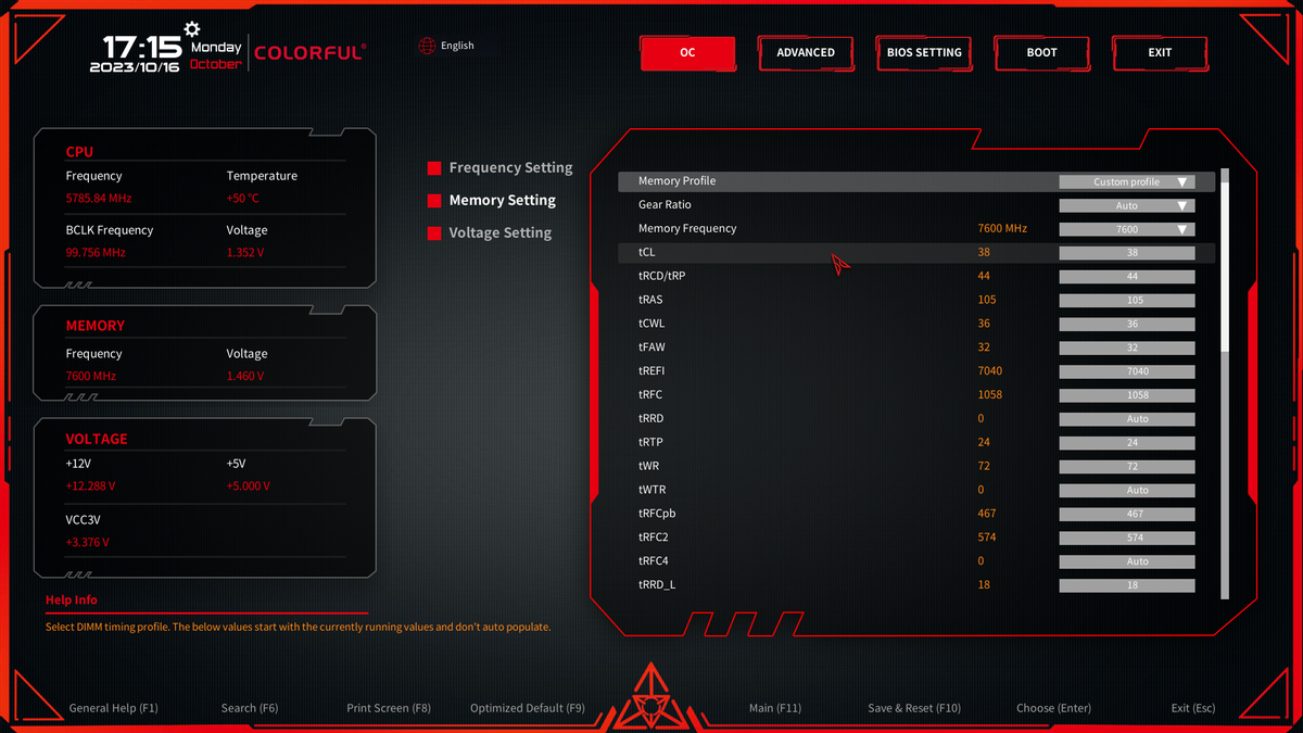 前面提到,这款七彩虹CVNB760IFROZENWIFID5V20登陆舰主板针对高频DDR5内存进行了优化设计,这里我们使用了酷睿i913900K和一对DDR57200的内存对主板进行了测试。在BIOS中依然提供了丰富且细致的内存设置选项,包括了Gear选择、内存频率调节、时序、电压设置等等,BIOS界面简洁,易用性强。我们首先使用内存的XMP设置,将内存超频到7200MHz,可以正常开机并通过测试。