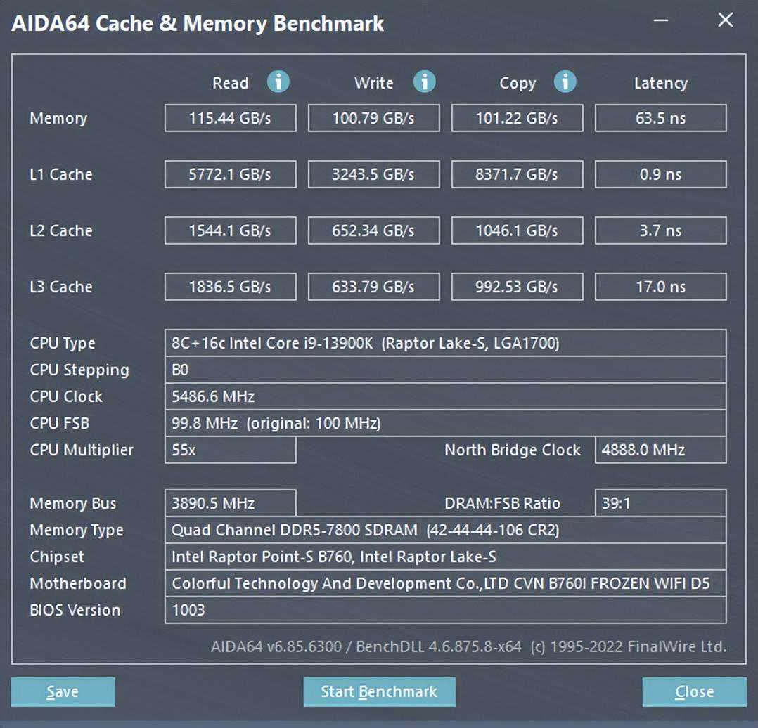 接下来,我们在XMP的基础上对其进行手动超频,经过多次尝试,我们最终将内存超频至7800MHz@42-44-44-106,在7800MHz的运行频率下,内存的读取、写入、拷贝速度都突破了100GB/s,表现非常优秀。如果搭配XMP8000内存或者体质更好的内存和处理器,七彩虹CVNB760IFROZENWIFID5V20登陆舰主板完全能够实现8000HMz甚至更高的内存频率。