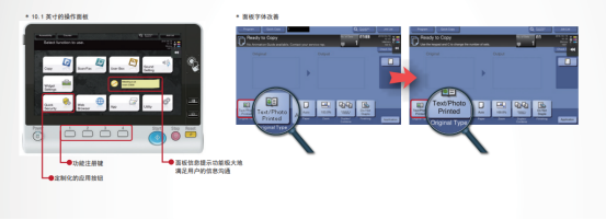 柯尼卡美能达C558配备了柯尼卡美能达办公机型迄今为止最大的10.1英寸的操作面板。超大的面板保证了良好的触摸反应,完善了操作体验并减少了误操作的可能性。同时,板上的文字字体得到了进一步的改进,其易读性和易识别度更高,使得面板整体更加美观。