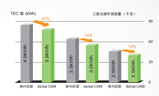 柯尼卡美能达C558在睡眠模式下最低的能耗仅为0.5w,极大程度地节省了能耗。与TEC标准值相比,新品的TEC值实现了14%-20%的下降,从而减少了二氧化碳的排放量,减小对环境的影响。