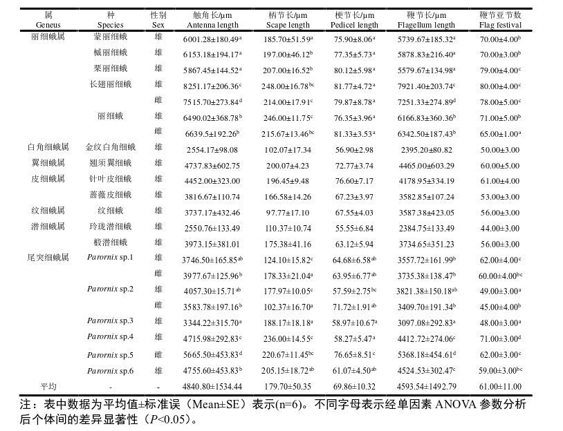 本研究只观察了纹细蛾1个种,其雄虫触角总长3737.17±432.46µm,柄节长97.77±17.10µm,梗节长67.55±4.03µm,鞭节长2395.20±80.82µm,鞭节亚节数55.67±2.73。