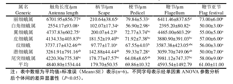 单因素ANOVA参数分析结果表明,在属间,触角的触角总长、柄节长、梗节长、鞭节长、鞭节亚节数差异均极显著()。
