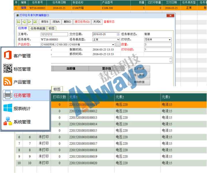 按照打印需求生成打印任务,并可根据实际打印情况分配任务,执行打印任务,支持系统数据导入,通过数据二次验证保证数据正确,监控打印状态,管理追溯打印数据。