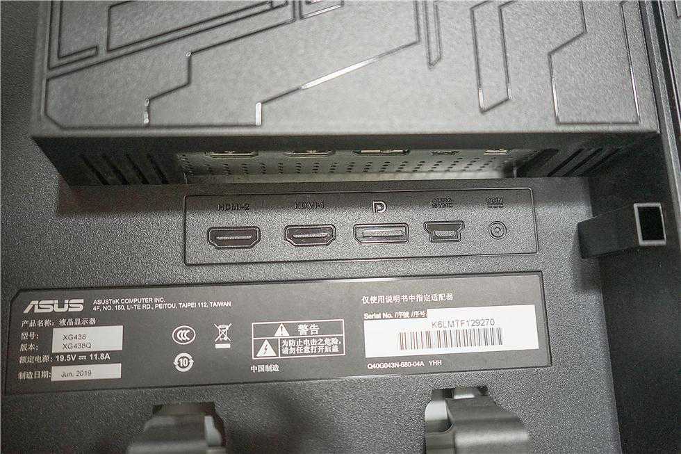 华硕ROGXG438Q显示器配备了一根DP线,一根HDMI线,以及一根USB线。USB线除了用于机身上的HUB接口外,射灯的AURA同步也依赖它。