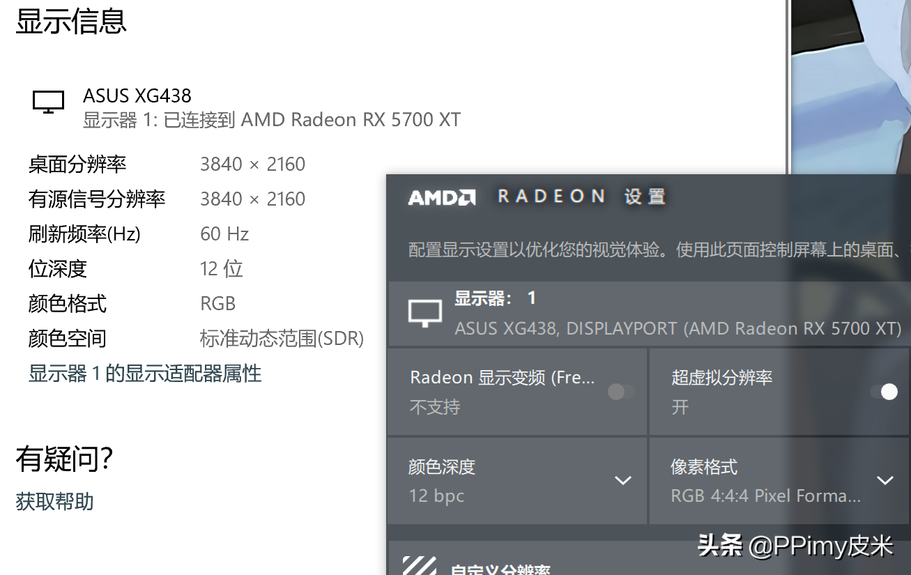值得一提的是,虽然显示器接口,显卡接口,线材都使用的是协议,但就是没法在同时开启10bit,120Hz和RGB4:4:4,我起初以为是AMD的锅,后来我换成RTX2070尝试了一下,结果也是一样的。只可以在10bit60HzRGB4:4:4或者8bit120HzRGB4:4:4再或者10bit120HzYCbCr4:2:2(不推荐)几种组合方式中选择,有可能现阶段的Windows还没有更新到协议吧,估摸着这个和系统支持有一定的关系,希望Windows未来的版本能解决这个问题。
